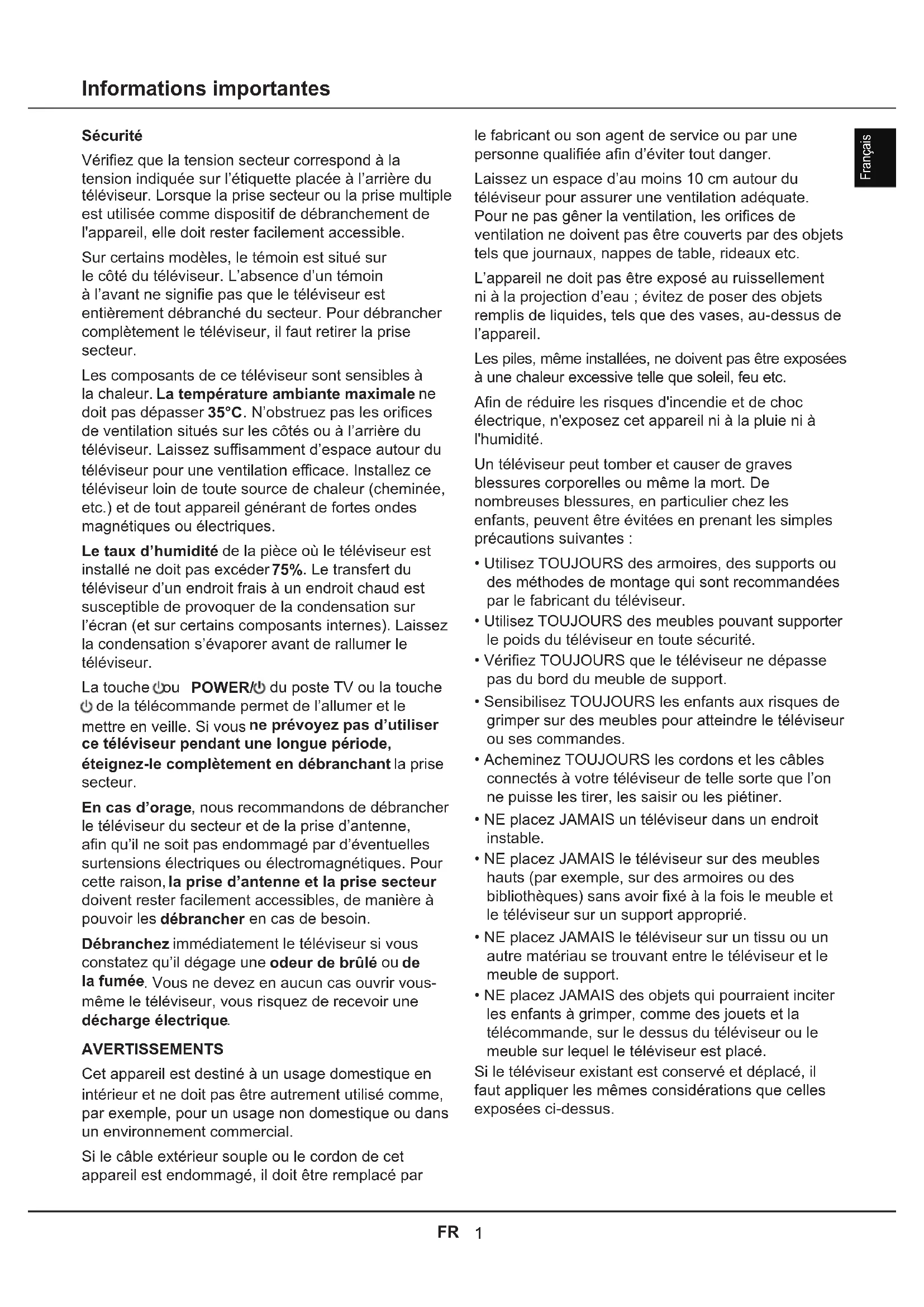AVERTISSEMENTS Cet appareil est destiné à un usage domestique en intérieur et ne doit pas être autrement utilisé comme, par exemple, pour un usage non domestique ou dans un environnement commercial. Si le câble extérieur souple ou le cordon de cet appareil est endommagé, il doit être remplacé par le fabricant ou son agent de service ou par une personne qualiée an d’éviter tout danger. Laissez un espace d’au moins 10 cm autour du téléviseur pour assurer une ventilation adéquate. Pour ne pas gêner la ventilation, les orices de ventilation ne doivent pas être couverts par des objets tels que journaux, nappes de table, rideaux etc. L’appareil ne doit pas être exposé au ruissellement ni à la projection d’eau ; évitez de poser des objets remplis de liquides, tels que des vases, au-dessus de l’appareil. Les piles, même installées, ne doivent pas être exposées à une chaleur excessive telle que soleil, feu etc. An de réduire les risques d'incendie et de choc électrique, n'exposez cet appareil ni à la pluie ni à l'humidité. Un téléviseur peut tomber et causer de graves blessures corporelles ou même la mort. De nombreuses blessures, en particulier chez les enfants, peuvent être évitées en prenant les simples précautions suivantes :