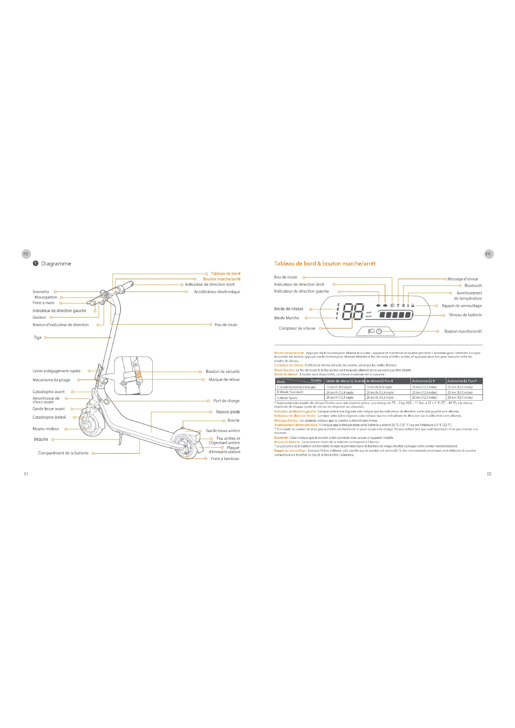 Tableau de bord & bouton marche/arrêt Compteur de vitesse Avertissement de température Rappel de verrouillage Bluetooth Mode de vitesse Mode Marche Feu de route Message d'erreur Niveau de batterie Bouton marche/arrêt Modèle Mode Limite de vitesse E2 II Limite de vitesse E2 Plus II 15km/h (9,3mph) 20km/h (12,4mph) 20km/h (12,4mph) 15km/h (9,3mph) 20km/h (12,4mph) 25km/h (15,5mph) Autonomie E2 Plus II* 25 km (15,5 miles) 25 km (15,5 miles) 20 km (12,4 miles) Autonomie E2 II* 25 km (15,5 miles) 20 km (12,4 miles) 20 km (12,4 miles) D (Mode Standard) E (mode économie d'énergie) S (Mode Sport) Sonnette Guidon Accélérateur électronique Bouton d'indicateur de direction Indicateur de direction gauche Indicateur de direction droit Mousqueton Tableau de bord Frein à main Feu de route Tige Bouton de sécurité Marque de retour Mécanisme de pliage Levier à dégagement rapide Garde-boue avant Moyeu moteur Port de charge Repose-pieds Boucle Garde-boue arrière Frein à tambour Plaque d'immatriculation Catadioptre latéral Catadioptre avant Amortisseur de chocs avant Béquille Compartiment de la batterie Bouton marche/arrêt Indicateur de direction gauche Indicateur de direction droit Feu arrière et Clignotant arrière
