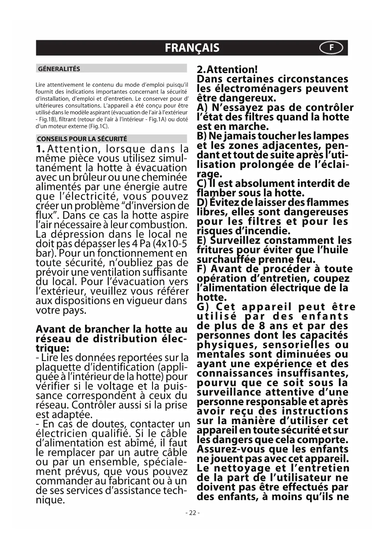 Dans certaines circonstances les électroménagers peuvent être dangereux. A) N’essayez pas de contrôler l’état des filtres quand la hotte est en marche. B) Ne jamais toucher les lampes et les zones adjacentes, pen- dant et tout de suite après l’uti- lisation prolongée de l’éclai- rage. C) Il est absolument interdit de flamber sous la hotte. D) Évitez de laisser des flammes libres, elles sont dangereuses pour les filtres et pour les risques d’incendie. E) Surveillez constamment les fritures pour éviter que l’huile surchauffée prenne feu. F) Avant de procéder à toute opération d’entretien, coupez l’alimentation électrique de la hotte. G) Cet appareil peut être utilisé par des enfants de plus de 8 ans et par des personnes dont les capacités physiques, sensorielles ou mentales sont diminuées ou ayant une expérience et des connaissances insuffisantes, pourvu que ce soit sous la surveillance attentive d’une personne responsable et après avoir reçu des instructions sur la manière d’utiliser cet appareil en toute sécurité et sur les dangers que cela comporte. Assurez-vous que les enfants ne jouent pas avec cet appareil. Le nettoyage et l’entretien de la part de l’utilisateur ne doivent pas être effectués par des enfants, à moins qu’ils ne- 23 - soient surveillés. H) Veillez à ce que les enfants ne jouent pas avec l’appareil.