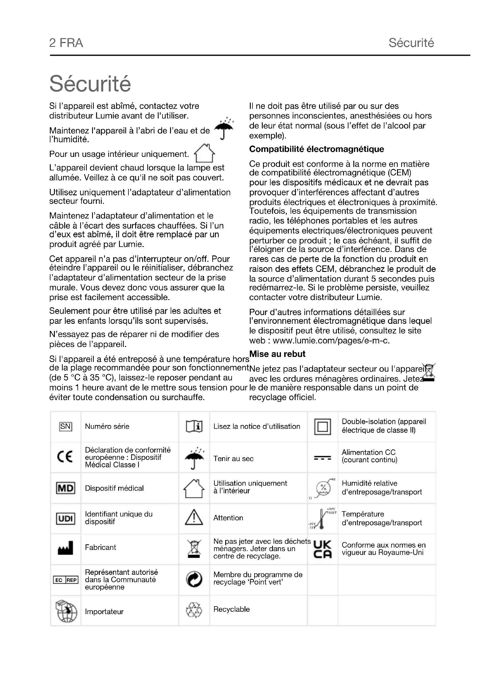 EntretienFRA 11 Description technique Sous réserve de modification sans préavis. Bodyclock Rise 100 Accessoire amovible : Adaptateur d’alimentation secteur (fourni) Entrée : 100–240 Vca, 50/60 Hz, 0,4 A max.; Sortie : 12 V ⎓ 1 A (12 W) Conditions de fonctionnement : Température : de 5° C à 35° C Humidité relative : 15 % à 93 % (sans condensation) Pression atmosphérique : 70 kPa à 106 kPa Conditions d'entreposage/de transport : Température : de -25° C à +70° C Humidité relative : 15 % à 93 % (sans condensation) Pression atmosphérique : 25 kPa à 106 kPa Déclaration de conformité européenne : Dispositif Médical Classe I Conforme aux normes envigueur au Royaume-Uni Dispositif médical Description technique12 FRA Contactez-nous Si vous avez des questions ou des problèmes concernant ce produit, ou si vous souhaitez nous faire part de suggestions susceptibles d'améliorer nos produits ou nos services, veuillez envoyer un e-mail à info@lumie.com. Outside In (Cambridge) Limited, 3 The Links, Trafalgar Way, Bar Hill, Cambridge, CB23 8UD, UK. Lumie est une marque déposée de : Outside In (Cambridge) Limited, enregistrée en Angleterre et au Pays de Galles. Numéro d’enregistrement : 2647359. N° de TVA : GB 880 9837 71 (UK) NL 826301381B01 (EU)