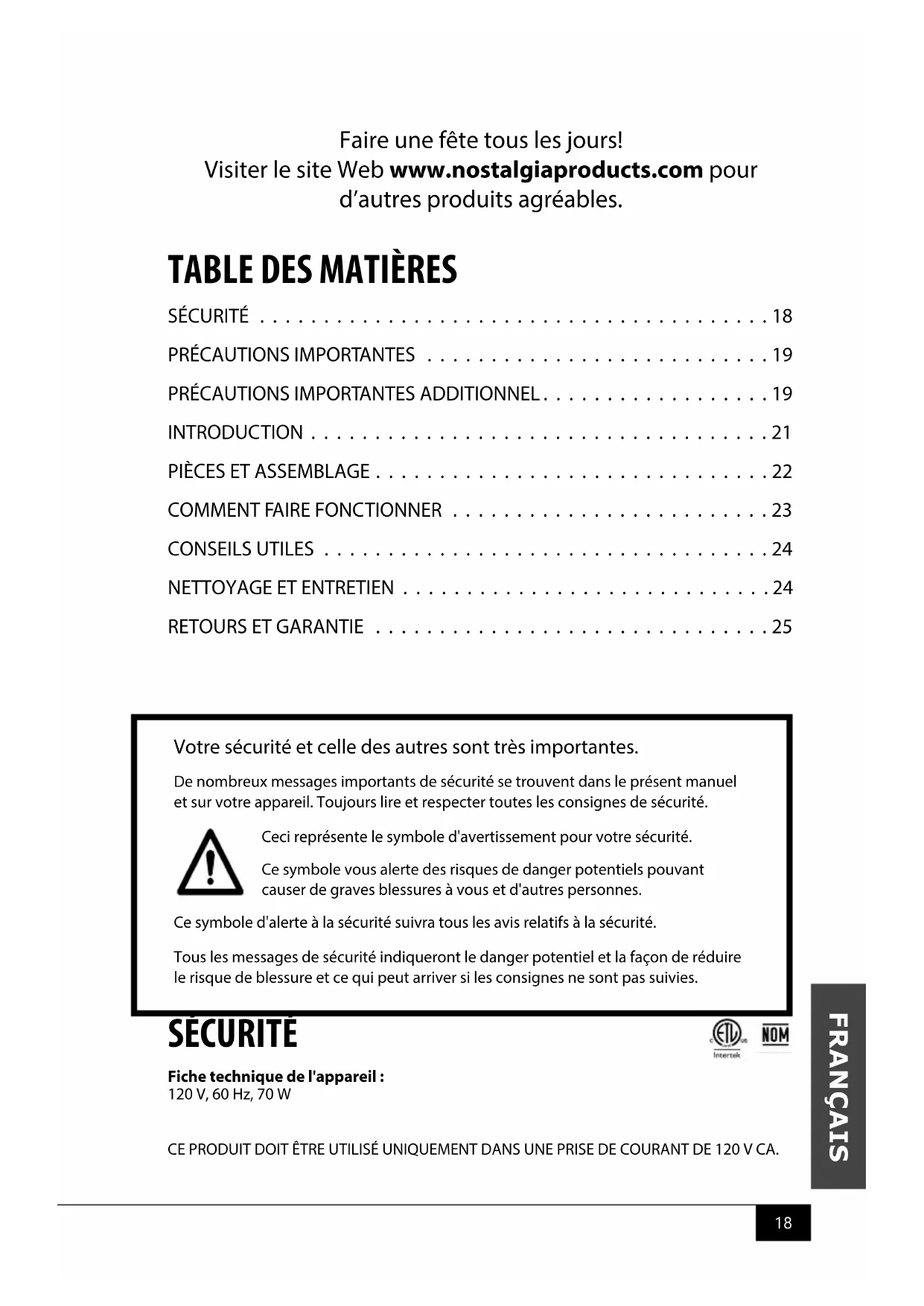 Pour toute question, communiquer par courriel ou au numéro de téléphone du service à la clientèle, entre 08 h 00 et 17 h 00, du lundi au vendredi, heure normale du Centre. Distribué par : Nostalgia Products LLC 1471 Partnership Dr. Green Bay, WI 54304-5685 Service à la clientèle Téléphone : (920) 347-9122 Site Web : www.nostalgiaproducts.com Demande pour le service à la clientèle Pour soumettre une demande au service à la clientèle, rendez vous au www.nostalgiaproducts.com puis remplissez le formulaire de demande au service à la clientèle puis cliquez sur le bouton Soumettre. Un représentant vous contactera dès que possible. Conditions de garantie du produit Le groupe Nostalgia Products LLC (référé tel « l’Entreprise ») garantit que pour une période d’un (1) an en date d’achat, ce produit est sans défaut de matériel et de fabrication selon une utilisation normale à domicile, seulement si le fonctionnement et l’entretien du produit sont conforment aux directives fournies. À titre de réparation exclusive et entière sous cette garantie, l’Entreprise pourra à sa discrétion, réparer ou remplacer le produit défectueux, voire émettre un remboursement du produit durant la période couverte sous garantie. Cette garantie n’est disponible seulement qu’à l’acheteur d’origine du produit, en date d’achat au détail dudit produit et sera valide uniquement avec le reçu de caisse d’origine, à titre de preuve d’achat, lequel est requis pour obtenir les bienfaits reliés à cette garantie. Toute réclamation doit être rapportée à l’attention de l’Entreprise dans la fenêtre de la période de la garantie, sans dépasser 30 jours à défaut de performance. Cette garantie ne couvre pas l’usure normale ou dommage cause par l'expédition, la mauvaise manipulation, la mauvaise utilisation, les accidents, les modications, les mauvaises pièces de remplacement, voire toute autre utilisation anormale du produit à domicile. Il est possible que vous ayez à retourner le produit (avec les frais de retour prépayés par vous) pour une inspection et une évaluation. Les frais des coûts de retour ne sont pas remboursables. L'Entreprise n’est aucunement responsable pour les retours endommagés ou perdus en transit. Autrement que spéciquement permit selon les directives de fonctionnement, cette garantie s’applique à une utilisation à domicile à d'intérieur seulement. An d'obtenir un service couvert sous cette garantie, veuillez contacter l'Entreprise au numéro de téléphone inclut ci-haut ou en remplissant le formulaire de demande au service à la clientele, sur le site www.nostalgiaproducts.com. La garantie est valide seulement aux États-Unis et au Canada. Cette garantie prévaut toute autre garantie, expresse ou implicite incluant les garanties de qualité marchande ou ayant une aptitude pour une intention en particulier, lesquelles sont exclues selon la loi. Sous aucun prétexte l’Entreprise ne pourra être tenue responsable pour tout dommage indirect, accidentel, conséquentiel ou spécial provenant de ou en relativité avec ce produit ou son utilisation. Certains états, provinces ou juridictions n'allouent pas l'exclusion ou la limitation de tels dommages accidentels ou conséquentiels, donc l'exclusion ou limitation suscitée peut ne pas s'appliquer à vous. Cette garantie ne s’applique pas à la merchandise de renaissance. Veuillez lire les directives de fonctionnement attentivement. Ne pas se conformer aux directives de fonctionnement annulera cette garantie. Pour plus d’informations, visitez notre site Web à www.nostalgiaproducts.com. Aimez-nous sur Facebook à l’adresse www.facebook.com / NostalgiaElectrics. Suivez nos conseils sur Pinterest à www.pinterest.com / nostalgiaelctrx. Tweet avec nous sur Twitter à l’adresse www.twitter.com / NostalgiaElctrx.