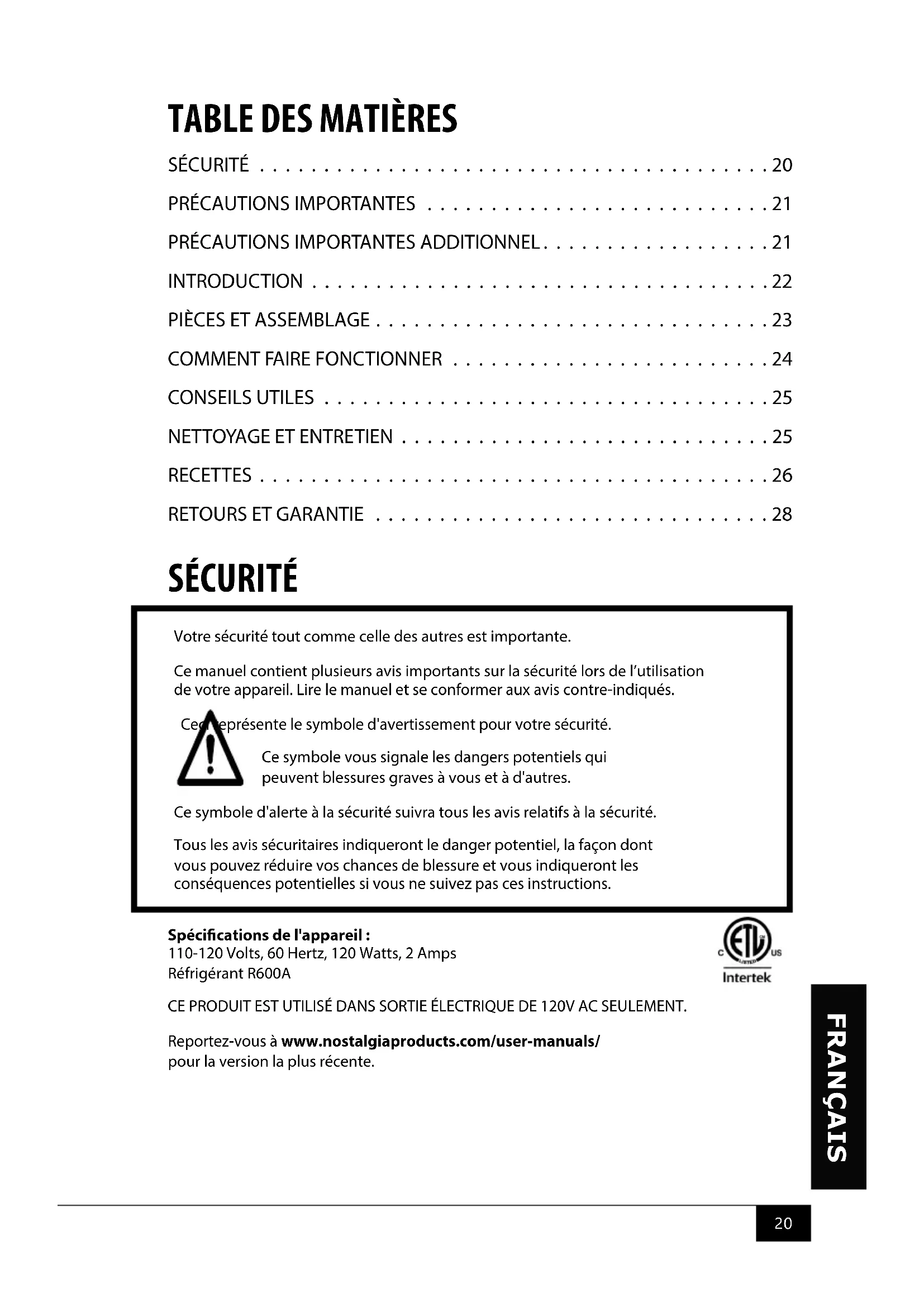SÉCURITÉ Spécications de l'appareil : 110-120 Volts, 60 Hertz, 120 Watts, 2 Amps Réfrigérant R600A CE PRODUIT EST UTILISÉ DANS SORTIE ÉLECTRIQUE DE 120V AC SEULEMENT. Reportez-vous à www.nostalgiaproducts.com/user-manuals/ pour la version la plus récente. Votre sécurité tout comme celle des autres est importante. Ce manuel contient plusieurs avis importants sur la sécurité lors de l’utilisation de votre appareil. Lire le manuel et se conformer aux avis contre-indiqués. Ceci représente le symbole d'avertissement pour votre sécurité. Ce symbole vous signale les dangers potentiels qui peuvent blessures graves à vous et à d'autres. Ce symbole d'alerte à la sécurité suivra tous les avis relatifs à la sécurité. Tous les avis sécuritaires indiqueront le danger potentiel, la façon dont vous pouvez réduire vos chances de blessure et vous indiqueront les conséquences potentielles si vous ne suivez pas ces instructions.21 FRANÇAIS