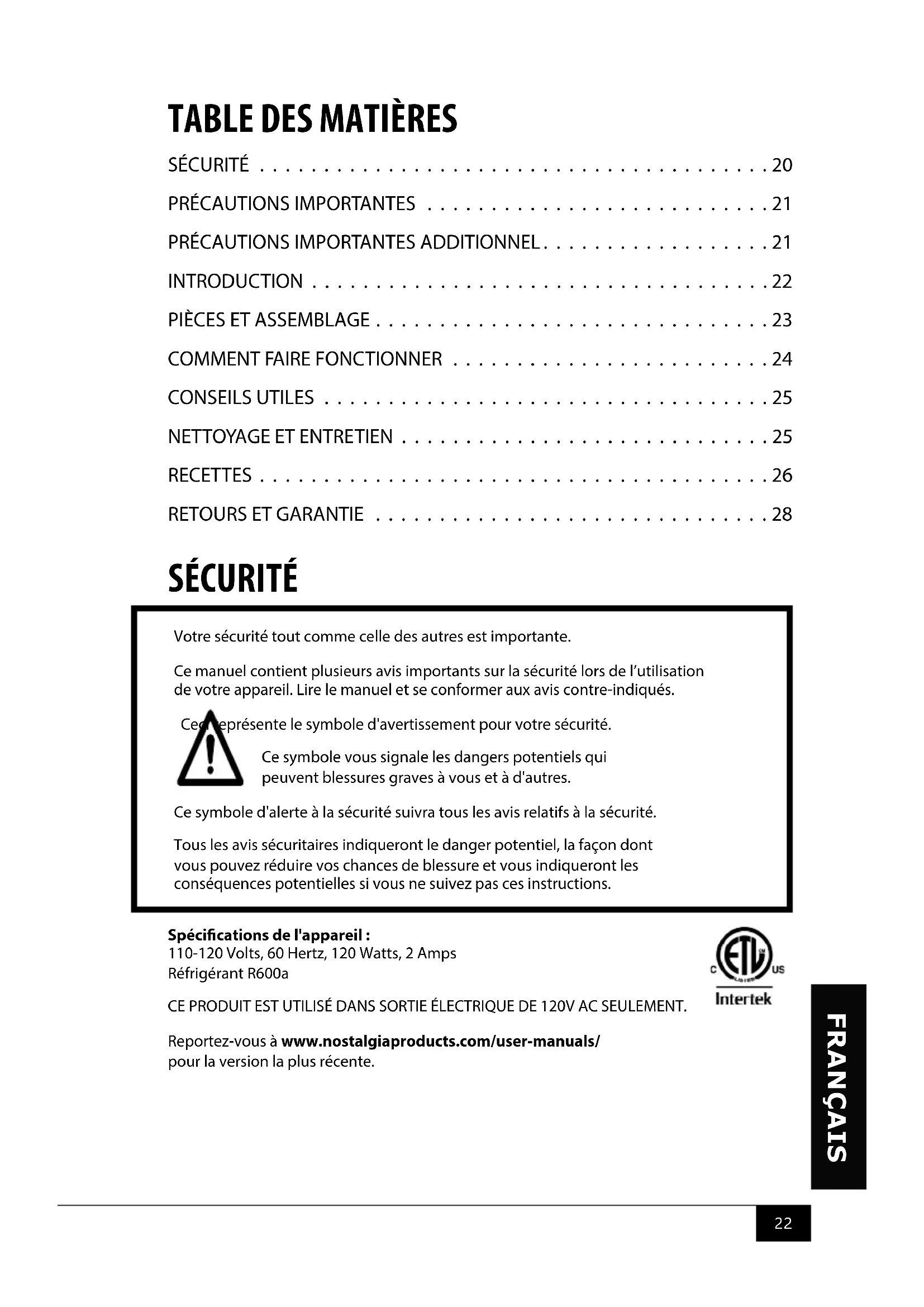 SÉCURITÉ Spécications de l'appareil : 110-120 Volts, 60 Hertz, 120 Watts, 2 Amps Réfrigérant R600a CE PRODUIT EST UTILISÉ DANS SORTIE ÉLECTRIQUE DE 120V AC SEULEMENT. Reportez-vous à www.nostalgiaproducts.com/user-manuals/ pour la version la plus récente. Votre sécurité tout comme celle des autres est importante. Ce manuel contient plusieurs avis importants sur la sécurité lors de l’utilisation de votre appareil. Lire le manuel et se conformer aux avis contre-indiqués. Ceci représente le symbole d'avertissement pour votre sécurité. Ce symbole vous signale les dangers potentiels qui peuvent blessures graves à vous et à d'autres. Ce symbole d'alerte à la sécurité suivra tous les avis relatifs à la sécurité. Tous les avis sécuritaires indiqueront le danger potentiel, la façon dont vous pouvez réduire vos chances de blessure et vous indiqueront les conséquences potentielles si vous ne suivez pas ces instructions.23 FRANÇAIS