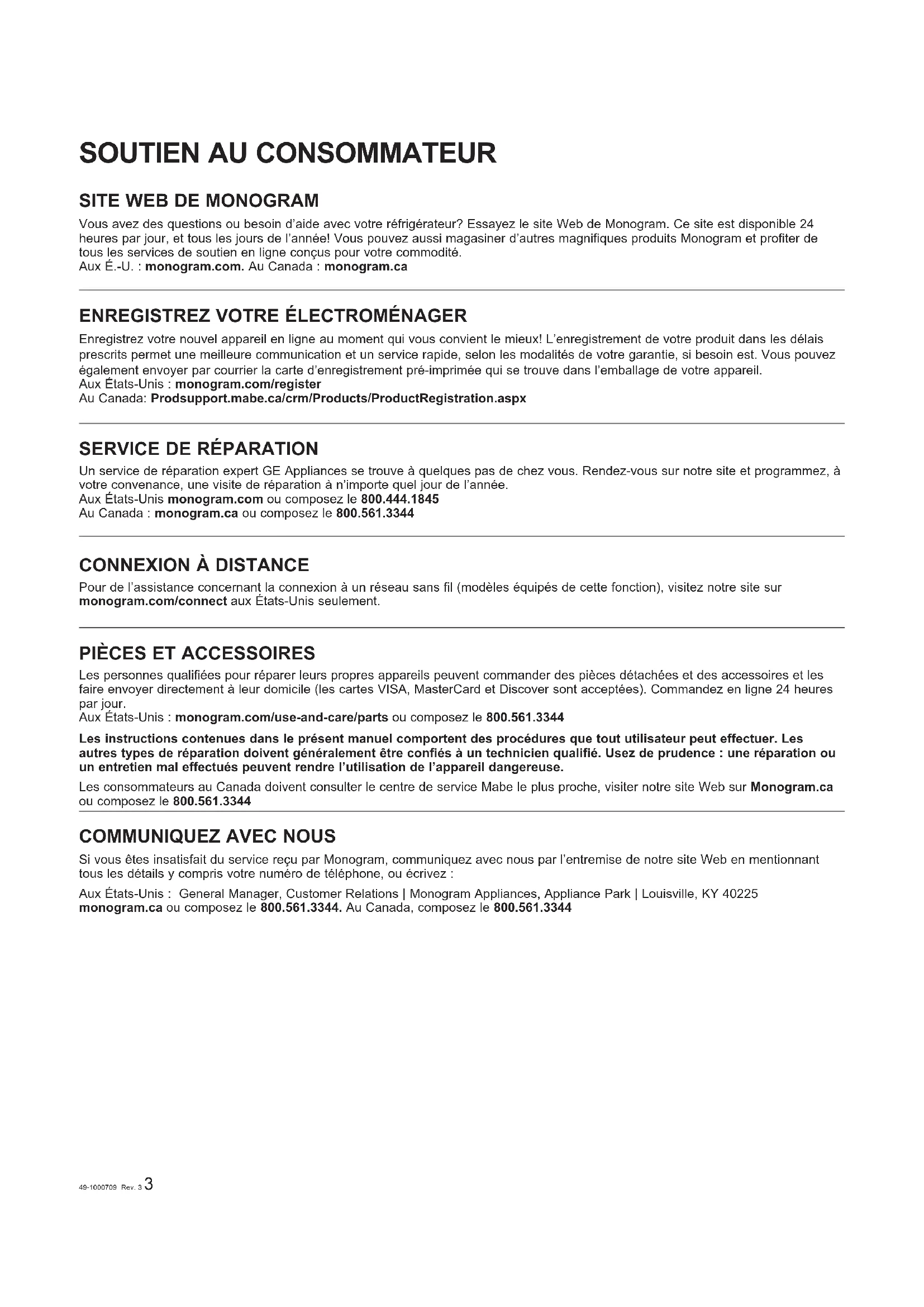 Un service de réparation expert GE Appliances se trouve à quelques pas de chez vous. Rendez-vous sur notre site et programmez, à votre convenance, une visite de réparation à n’importe quel jour de l’année. Aux États-Unis monogram.com ou composez le 800.444.1845 Au Canada : monogram.ca ou composez le 800.561.3344 CONNEXION À DISTANCE Pour de l’assistance concernant la connexion à un réseau sans fil (modèles équipés de cette fonction), visitez notre site sur monogram.com/connect aux États-Unis seulement.