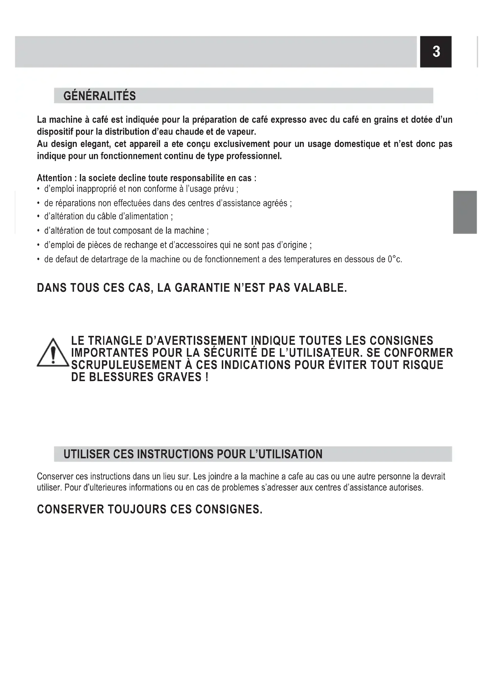 - de defaut de detartrage de la machine ou de fonctionnement a des temperatures en dessous de 0°c. DANS TOUS CES CAS, LA GARANTIE N’EST PAS VALABLE. Conserver ces instructions dans un lieu sur. Les joindre a la machine a cafe au cas ou une autre personne la devrait utiliser. Pour d’ulterieures informations ou en cas de problemes s’adresser aux centres d’assistance autorises. CONSERVER TOUJOURS CES CONSIGNES. LE TRIANGLE D’AVERTISSEMENT INDIQUE TOUTES LES CONSIGNES IMPORTANTES POUR LA SÉCURITÉ DE L’UTILISATEUR. SE CONFORMER SCRUPULEUSEMENT À CES INDICATIONS POUR ÉVITER TOUT RISQUE DE BLESSURES GRAVES !