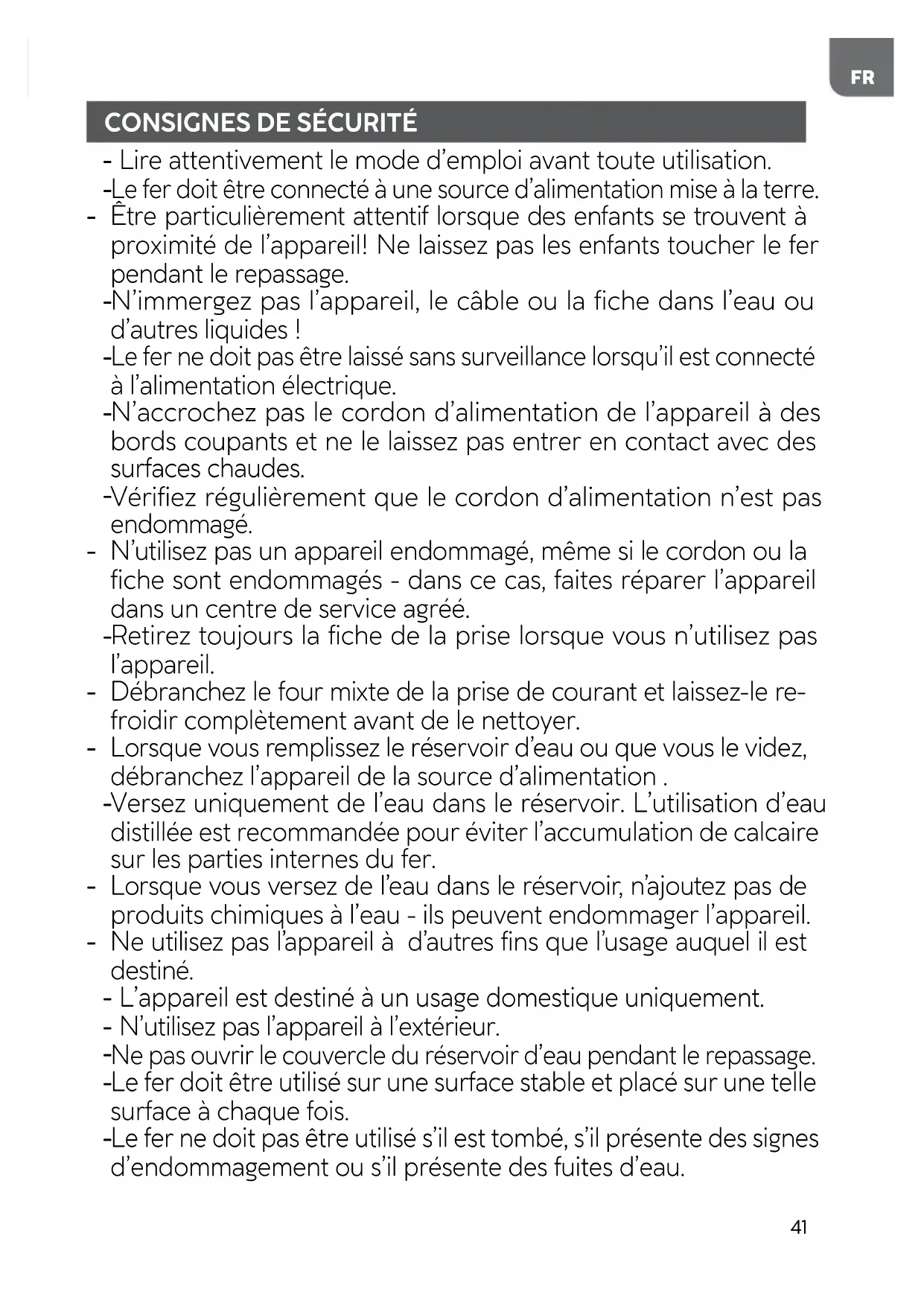 Le fer ne doit pas être utilisé s’il est tombé, s’il présente des signes d’endommagement ou s’il présente des fuites d’eau.42