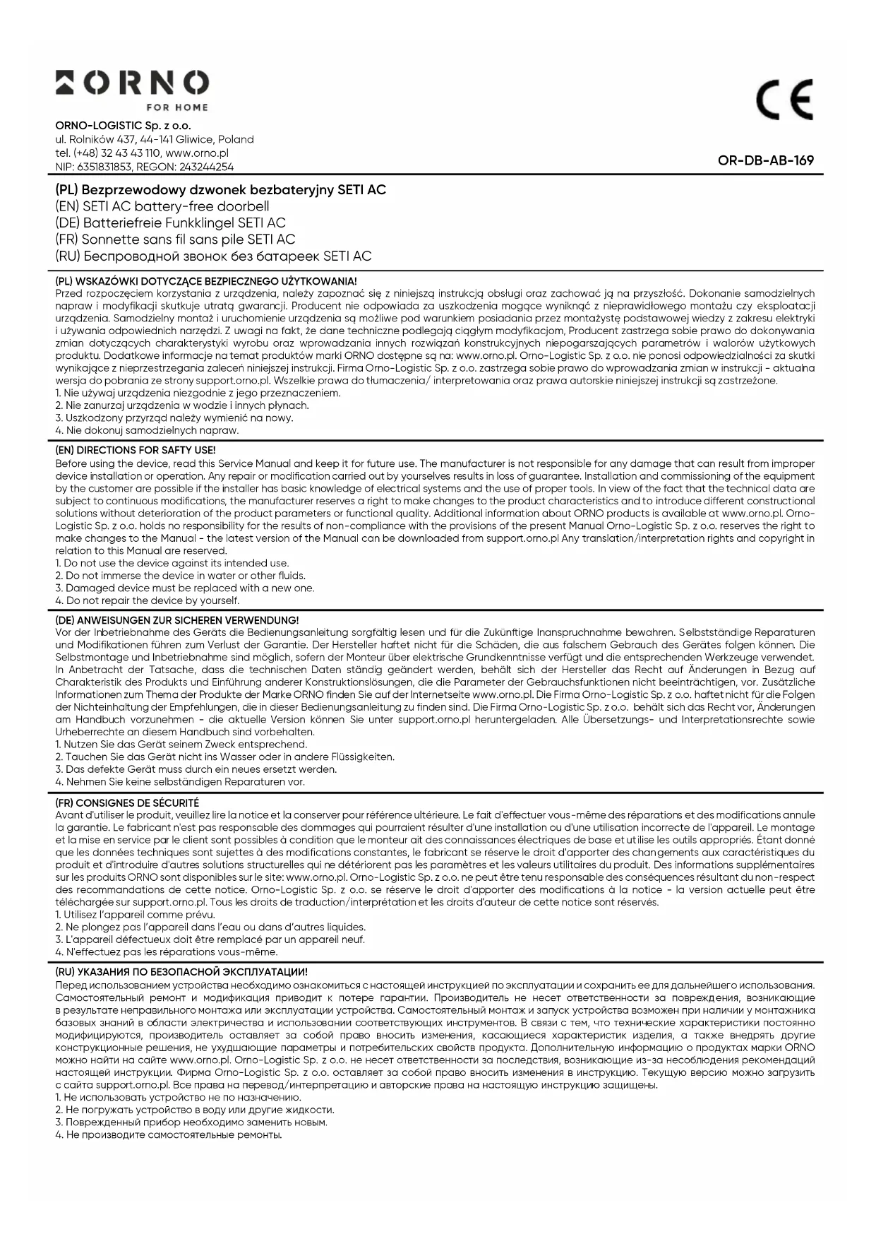 Orno-Logistic Sp. z o.o. déclare que la sonnette sans fil OR-DB-AB-169 SETI AC est compatible avec la directive 2014/53/UE. Le texte complet de la déclaration de conformité de l'UE est disponible à l'adresse Internet suivante : www.orno.pl.