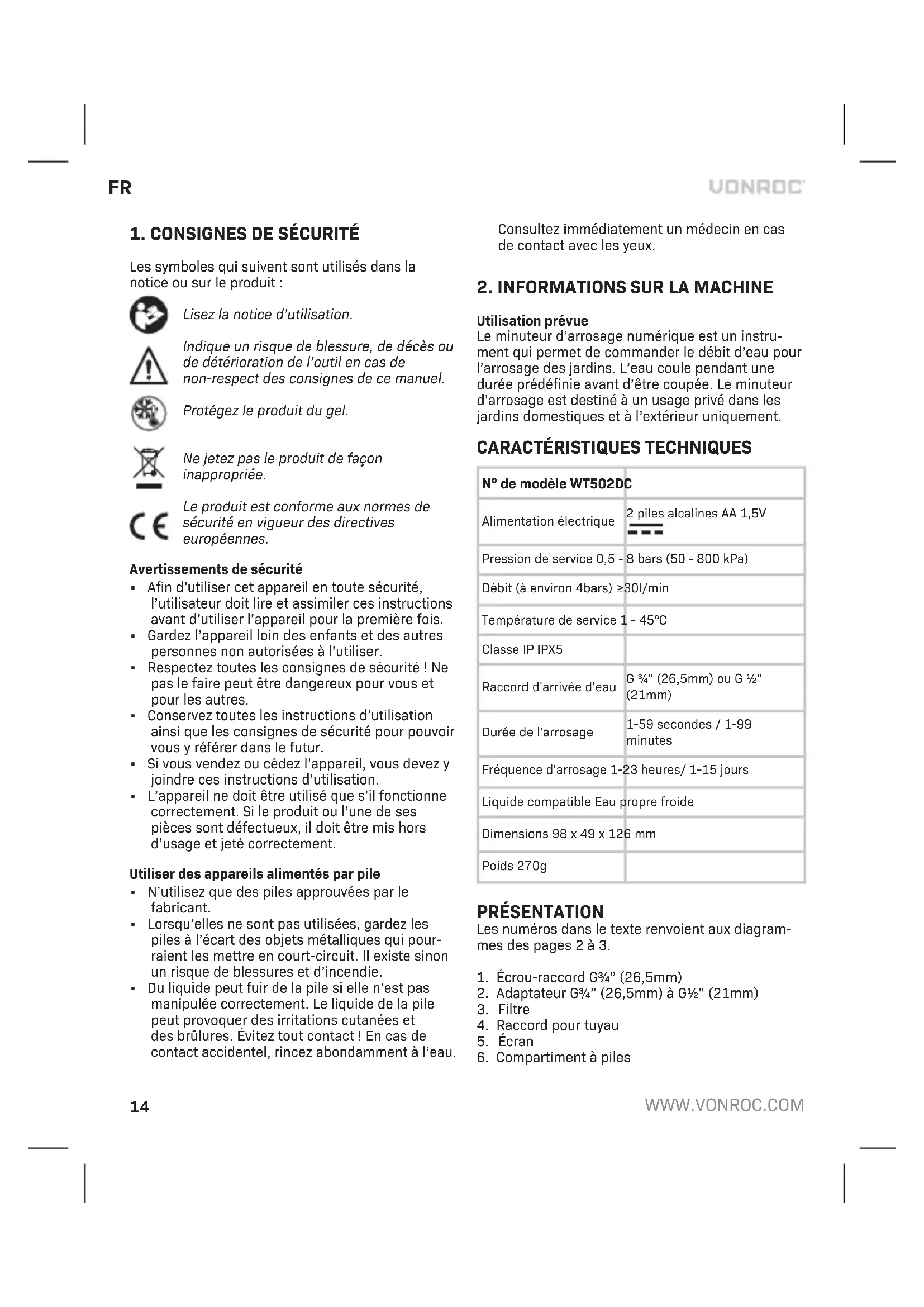 WT502DC - Programmateur d'arrosage Vonroc - Notice d'utilisation et mode d'emploi gratuit