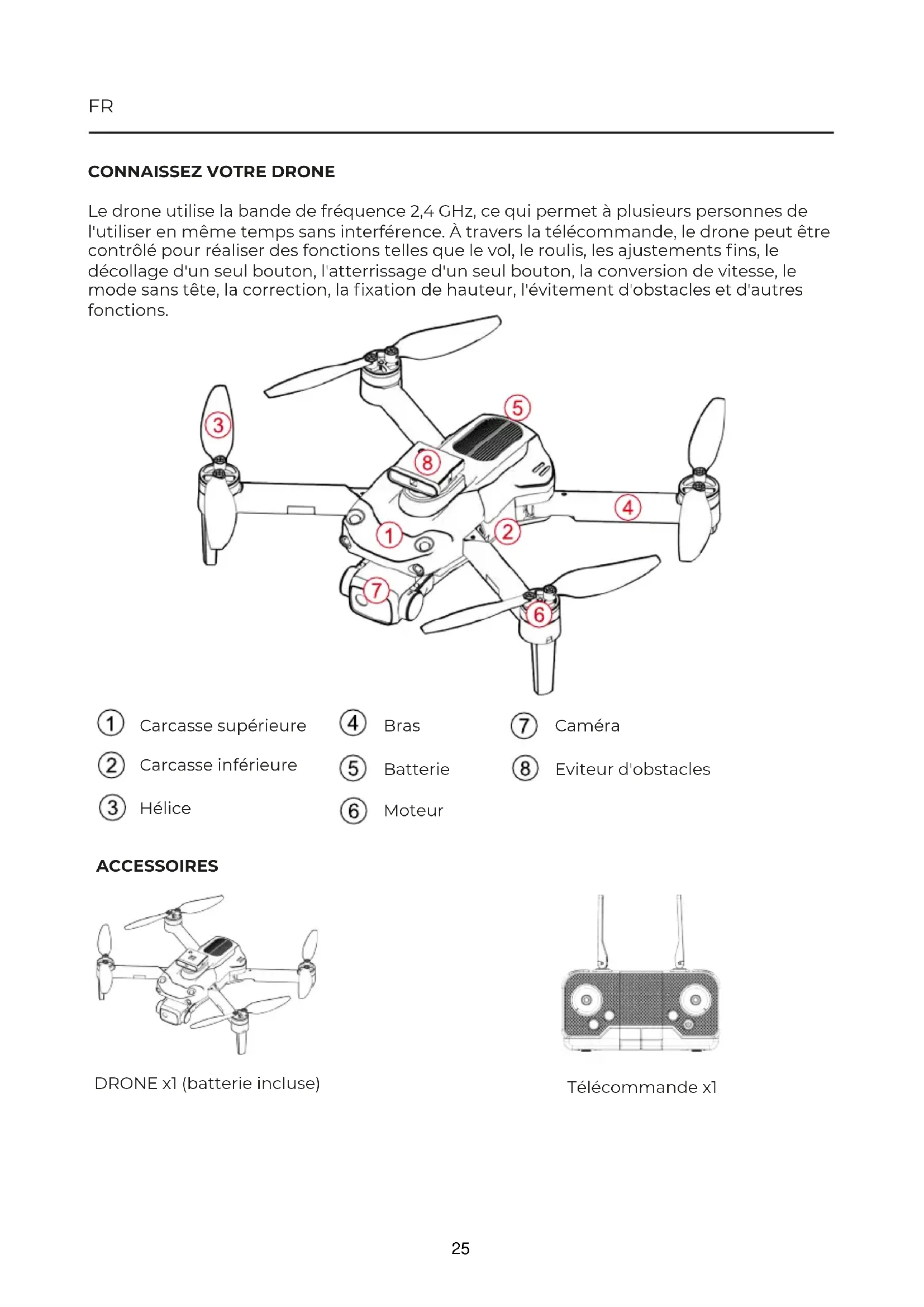 Le drone utilise la bande de fréquence 2,4 GHz, ce qui permet à plusieurs personnes de l'utiliser en même temps sans interférence. À travers la télécommande, le drone peut être contrôlé pour réaliser des fonctions telles que le vol, le roulis, les ajustements fins, le décollage d'un seul bouton, l'atterrissage d'un seul bouton, la conversion de vitesse, le mode sans tête, la correction, la fixation de hauteur, l'évitement d'obstacles et d'autres fonctions. ACCESSOIRES Carcasse supérieure DRONE x1 (batterie incluse) Télécommande x1 Carcasse inférieure Hélice Bras Batterie Moteur Caméra Eviteur d'obstacles