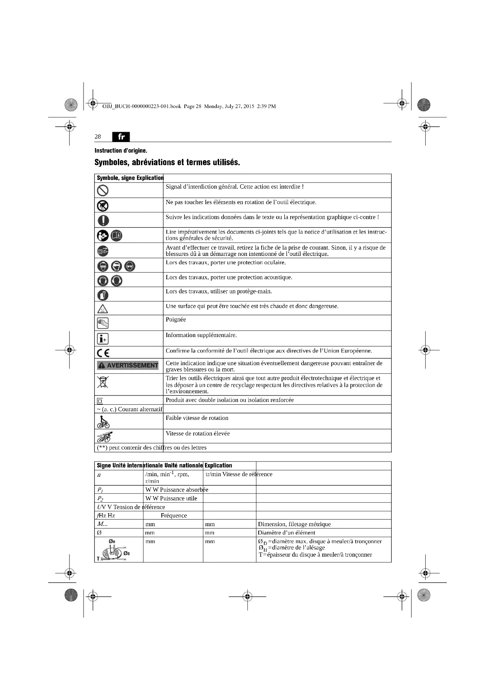 Instruction d’origine. Symboles, abréviations et termes utilisés. Symbole, signe Explication Signal d’interdiction général. Cette action est interdite ! Ne pas toucher les éléments en rotation de l’outil électrique. Suivre les indications données dans le texte ou la représentation graphique ci-contre ! Lire impérativement les documents ci-joints tels que la notice d’utilisation et les instruc- tions générales de sécurité. Avant d’effectuer ce travail, retirez la fiche de la prise de courant. Sinon, il y a risque de blessures dû à un démarrage non intentionné de l’outil électrique. Lors des travaux, porter une protection oculaire. Lors des travaux, porter une protection acoustique. Lors des travaux, utiliser un protège-main. Une surface qui peut être touchée est très chaude et donc dangereuse. Poignée Information supplémentaire. Confirme la conformité de l’outil électrique aux directives de l’Union Européenne. Cette indication indique une situation éventuellement dangereuse pouvant entraîner de graves blessures ou la mort. Trier les outils électriques ainsi que tout autre produit électrotechnique et électrique et les déposer à un centre de recyclage respectant les directives relatives à la protection de l’environnement. Produit avec double isolation ou isolation renforcée ~ (a. c.) Courant alternatif Faible vitesse de rotation Vitesse de rotation élevée (**) peut contenir des chiffres ou des lettres AVERTISSEMENT Signe Unité internationale Unité nationale Explication
