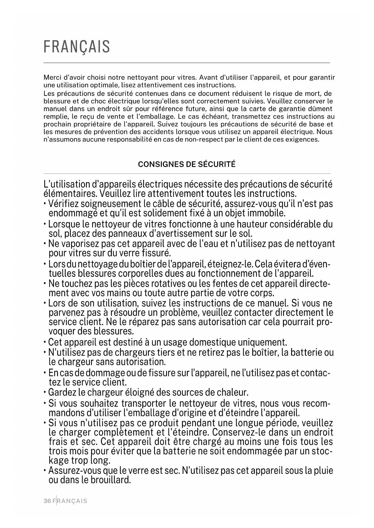 - Quando não houver areia ou poeira, borrife levemente água limpa ou detergente várias vezes no esfregão ou no vidro, sem molhá-lo demais.36 FRANÇAIS FRANÇAIS Merci d'avoir choisi notre nettoyant pour vitres. Avant d'utiliser l'appareil, et pour garantir une utilisation optimale, lisez attentivement ces instructions. Les précautions de sécurité contenues dans ce document réduisent le risque de mort, de blessure et de choc électrique lorsqu'elles sont correctement suivies. Veuillez conserver le manuel dans un endroit sûr pour référence future, ainsi que la carte de garantie dûment remplie, le reçu de vente et l'emballage. Le cas échéant, transmettez ces instructions au prochain propriétaire de l'appareil. Suivez toujours les précautions de sécurité de base et les mesures de prévention des accidents lorsque vous utilisez un appareil électrique. Nous n'assumons aucune responsabilité en cas de non-respect par le client de ces exigences.
