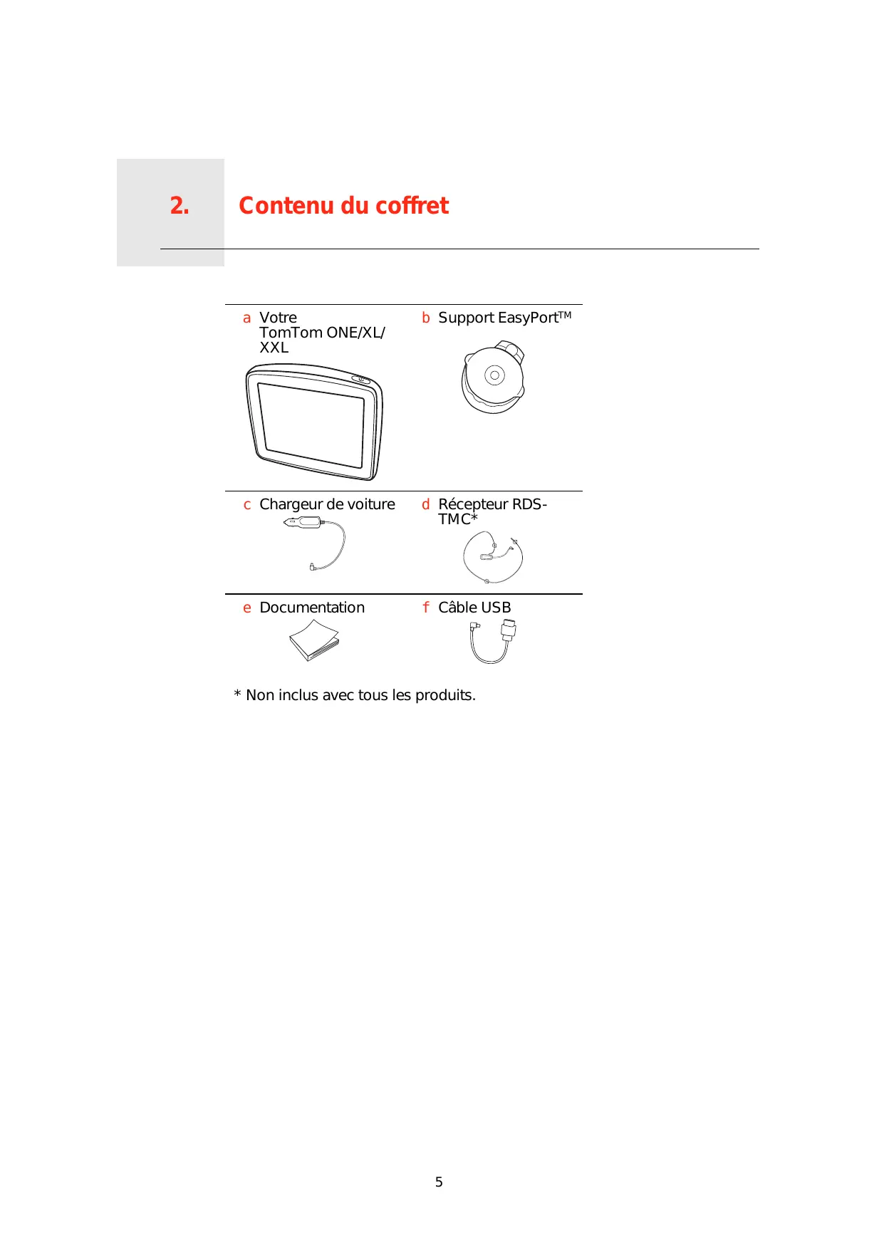 Contenu du coffret Contenu du coffret a Votre TomTom ONE/XL/ XXL b Support EasyPortTM c Chargeur de voiture d Récepteur RDSTMC* e Documentation f Câble USB