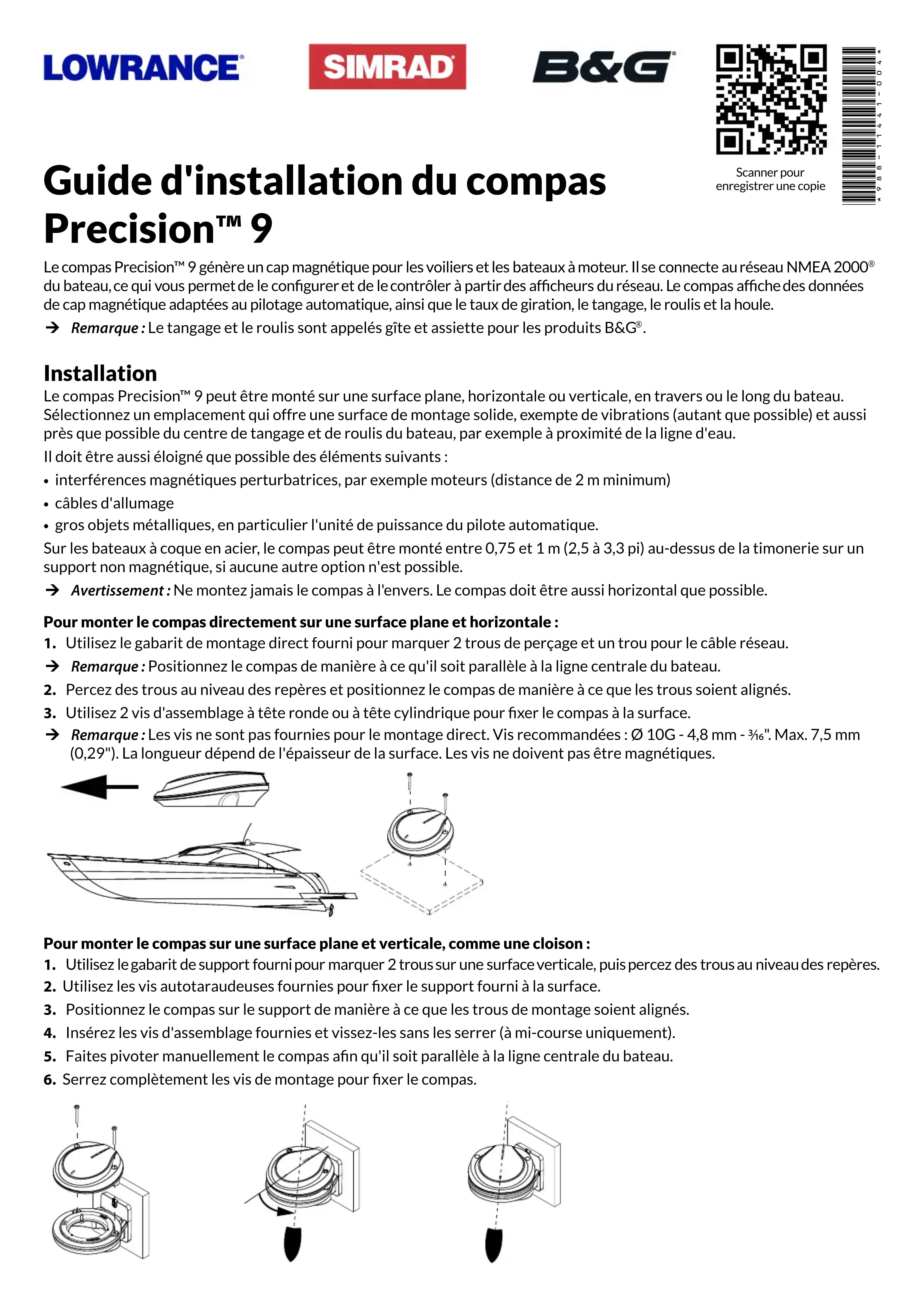 Le compas Precision™ 9 peut être monté sur une surface plane, horizontally ou verticale, en travers ou le long du bateau. Sélectionnez un emplacement qui offre une surface de montage solide, exemple de vibrations (autant que possible) et aussi près que possible du centre de tangage et de roulis du bateau, par exemple à proximité de la ligne d'eau.