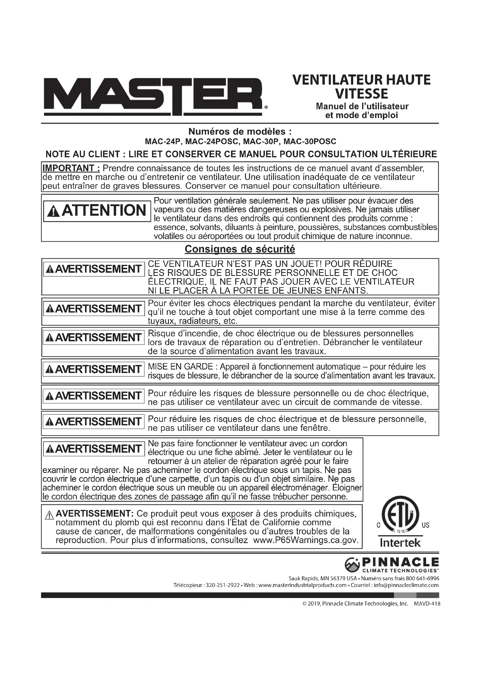 86& Sauk Rapids, MN 56379 USA • Numéro sans frais 800641-6996 Télécopieur : 320-251-2922 • Web : www.masterindustrialproducts.com • Courriel : info@pinnacleclimate.com © 2019, Pinnacle Climate Technologies, Inc. MAVD-418 Manuel de l’utilisateur et mode d’emploi VENTILATEUR HAUTE VITESSE