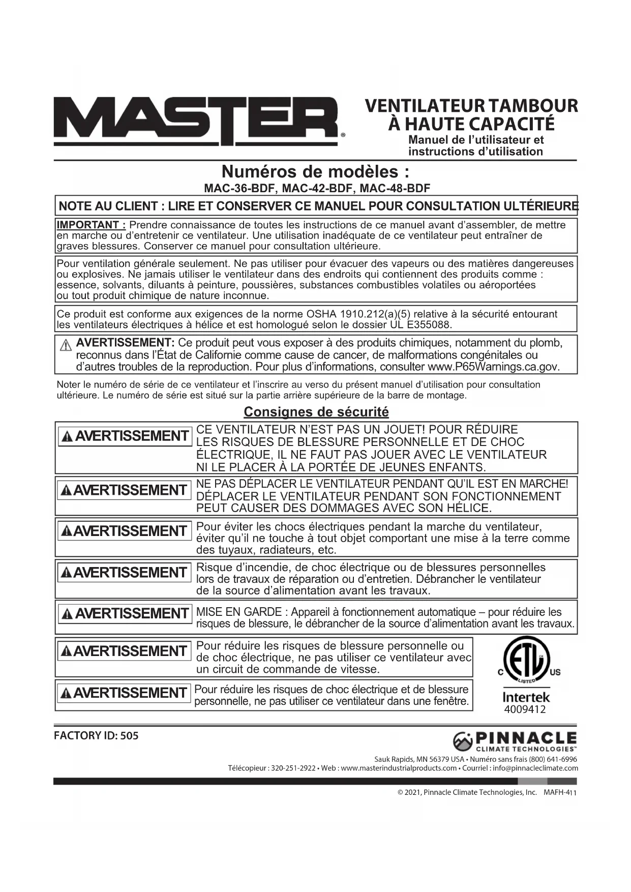 TECHNOLOGIES, INC. ASSUMES NO RESPONSIBILITY FOR ANY DEFECTS CAUSED BY THIRD PARTIES. THIS LIMITED WARRANTY GIVES THE PURCHASER SPECIFIC LEGAL RIGHTS; A PURCHASER MAY HAVE OTHER RIGHTS DEPENDING UPON WHERE HE OR SHE LIVES. SOME STATES DO NOT ALLOW THE EXCLUSION OR LIMITA- TION OF SPECIAL, INCIDENTAL OR CONSEQUENTIAL DAMAGES, OR LIMITATIONS ON HOW LONG A WARRANTY LASTS, SO THE ABOVE EXCLUSION AND LIMITATIONS MAY NOT APPLY TO YOU. PINNACLE CLIMATE TECHNOLOGIES, INC. DOES NOT AUTHORIZE ANY PERSON OR COMPANY TO ASSUME FOR IT ANY OTHER OBLI- GATION OR LIABILITY IN CONNECTION WITH THE SALE, INSTAL- LATION, USE, REMOVAL, RETURN, OR REPLACEMENT OF ITS EQUIPMENT, AND NO SUCH REPRESENTATIONS ARE BINDING ON PINNACLE CLIMATE TECHNOLOGIES, INC. ALWAYS BE SURE TO SPECIFY MODEL NUMBER AND SERIAL NUMBER WHEN MAKING ANY CLAIM WITH PINNACLE CLIMATE TECHNOLOGIES, INC. FOR YOUR CONVENIENCE USE THE SPACE PRO- VIDED BELOW TO LIST THIS INFORMATION: Model #: ____________________ Serial #: ______________________ Date of Purchase: _________________ 4Numéros de modèles : MAC-36-BDF, MAC-42-BDF, MAC-48-BDFCe produit est conforme aux exigences de la norme OSHA 1910.212(a)(5) relative à la sécurité entourant les ventilateurs électriques à hélice et est homologué selon le dossier UL E355088.Noter le numéro de série de ce ventilateur et l’inscrire au verso du présent manuel d’utilisation pour consultation ultérieure. Le numéro de série est situé sur la partie arrière supérieure de la barre de montage. NOTE AU CLIENT : LIRE ET CONSERVER CE MANUEL POUR CONSULTATION ULTÉRIEURE IMPORTANT : Prendre connaissance de toutes les instructions de ce manuel avant d’assembler, de mettre en marche ou d’entretenir ce ventilateur. Une utilisation inadéquate de ce ventilateur peut entraîner de graves blessures. Conserver ce manuel pour consultation ultérieure.Pour ventilation générale seulement. Ne pas utiliser pour évacuer des vapeurs ou des matières dangereuses ou explosives. Ne jamais utiliser le ventilateur dans des endroits qui contiennent des produits comme : essence, solvants, diluants à peinture, poussières, substances combustibles volatiles ou aéroportées ou tout produit chimique de nature inconnue. Consignes de sécurité CE VENTILATEUR N’EST PAS UN JOUET! POUR RÉDUIRE LES RISQUES DE BLESSURE PERSONNELLE ET DE CHOC ÉLECTRIQUE, IL NE FAUT PAS JOUER AVEC LE VENTILATEUR NI LE PLACER À LA PORTÉE DE JEUNES ENFANTS.NE PAS DÉPLACER LE VENTILATEUR PENDANT QU’IL EST EN MARCHE DÉPLACER LE VENTILATEUR PENDANT SON FONCTIONNEMENT PEUT CAUSER DES DOMMAGES AVEC SON HÉLICE.Risque d’incendie, de choc électrique ou de blessures personnelles lors de travaux de réparation ou d’entretien. Débrancher le ventilateur de la source d’alimentation avant les travaux.MISE EN GARDE : Appareil à fonctionnement automatique – pour réduire les risques de blessure, le débrancher de la source d’alimentation avant les travaux.Pour éviter les chocs électriques pendant la marche du ventilateur, éviter qu’il ne touche à tout objet comportant une mise à la terre comme des tuyaux, radiateurs, etc. AVERTISSEMENT AVERTISSEMENT AVERTISSEMENT AVERTISSEMENT AVERTISSEMENT Pour réduire les risques de blessure personnelle ou de choc électrique, ne pas utiliser ce ventilateur avec un circuit de commande de vitesse.Pour réduire les risques de choc électrique et de blessure personnelle, ne pas utiliser ce ventilateur dans une fenêtre. AVERTISSEMENT AVERTISSEMENT Sauk Rapids, MN 56379 USA • Numéro sans frais (800)641-6996Télécopieur : 320-251-2922 • Web : www.masterindustrialproducts.com • Courriel : info@pinnacleclimate.com© 2021, Pinnacle Climate Technologies, Inc. MAFH-4 Manuel de l’utilisateur et instructions d’utilisation VENTILATEUR TAMBOUR À HAUTE CAPACITÉ AVERTISSEMENT: Ce produit peut vous exposer à des produits chimiques, notamment du plomb, reconnus dans l’État de Californie comme cause de cancer, de malformations congénitales ou d’autres troubles de la reproduction. Pour plus d’informations, consulter www.P65Warnings.ca.gov.4009412FACTORY ID: 505NE JAMAIS LAISSER UN VENTILATEUR SANS SURVEILLANCE LORSQU’IL EST EN MARCHE OU BRANCHÉ À UNE SOURCE D’ALIMENTATION. © 2021, Pinnacle Climate Technologies, Inc. Manuel d’utilisation du ventilateur tambour à haute capacité Installation et assemblage Pose des roulettes (Figure 1)
