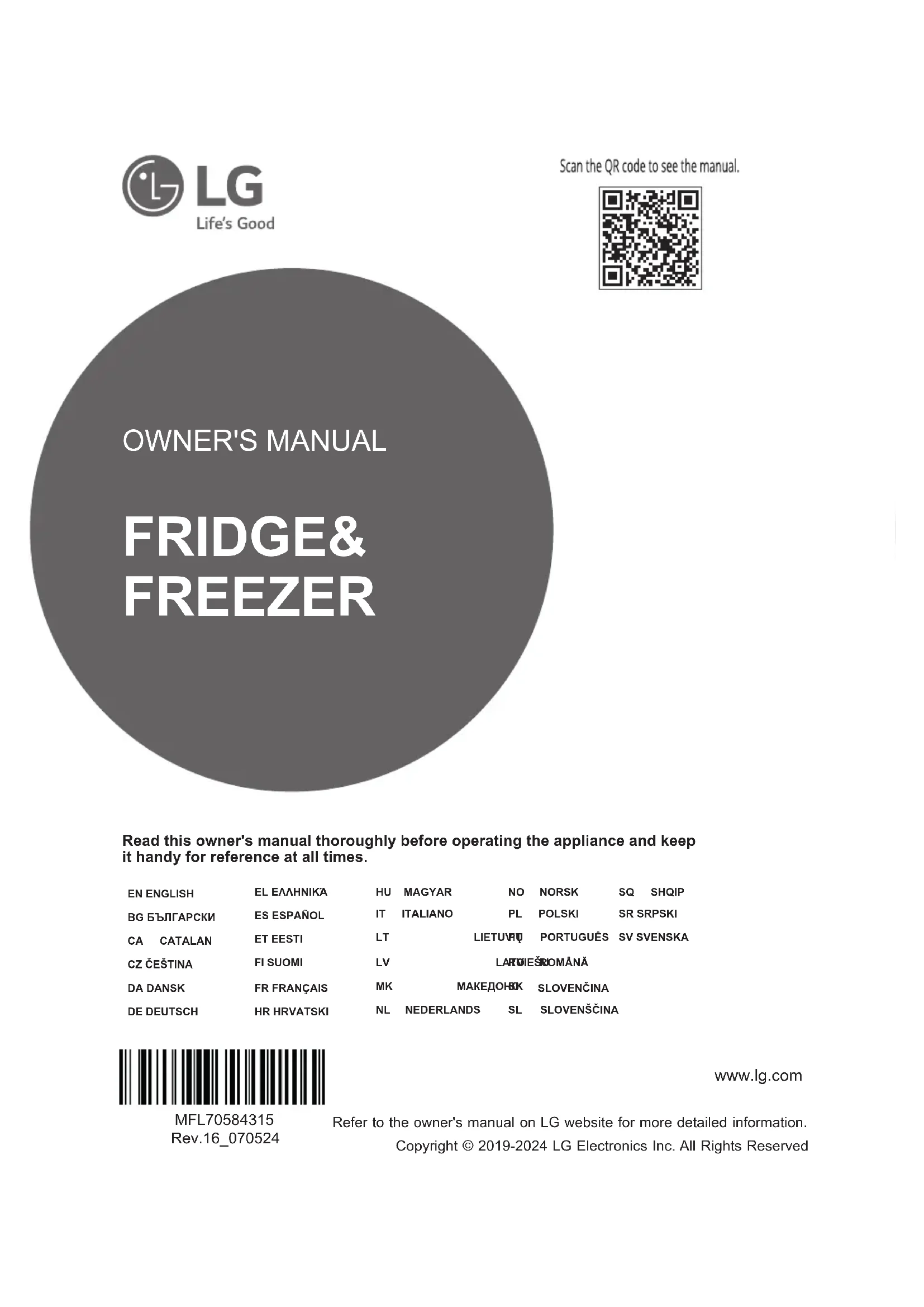 CONGÉLATEUR Lisez attentivement le manuel du propriétaire avant d'utiliser l'appareil et gardez-le à portée de main pour vous y référer à tout moment. Se référer au guide du propriétaire sur le siteweb de LG pour des informations plus détaillées. Copyright © 2019-2024 LG Electronics Inc. Tous droits réservés Scannez le QR code pour voir le manuel.TABLE DES MATIÈRES Ce manuel peut contenir des images ou un contenu différent du modèle que vous avez acheté. Ce manuel est sujet à révision par le fabricant.