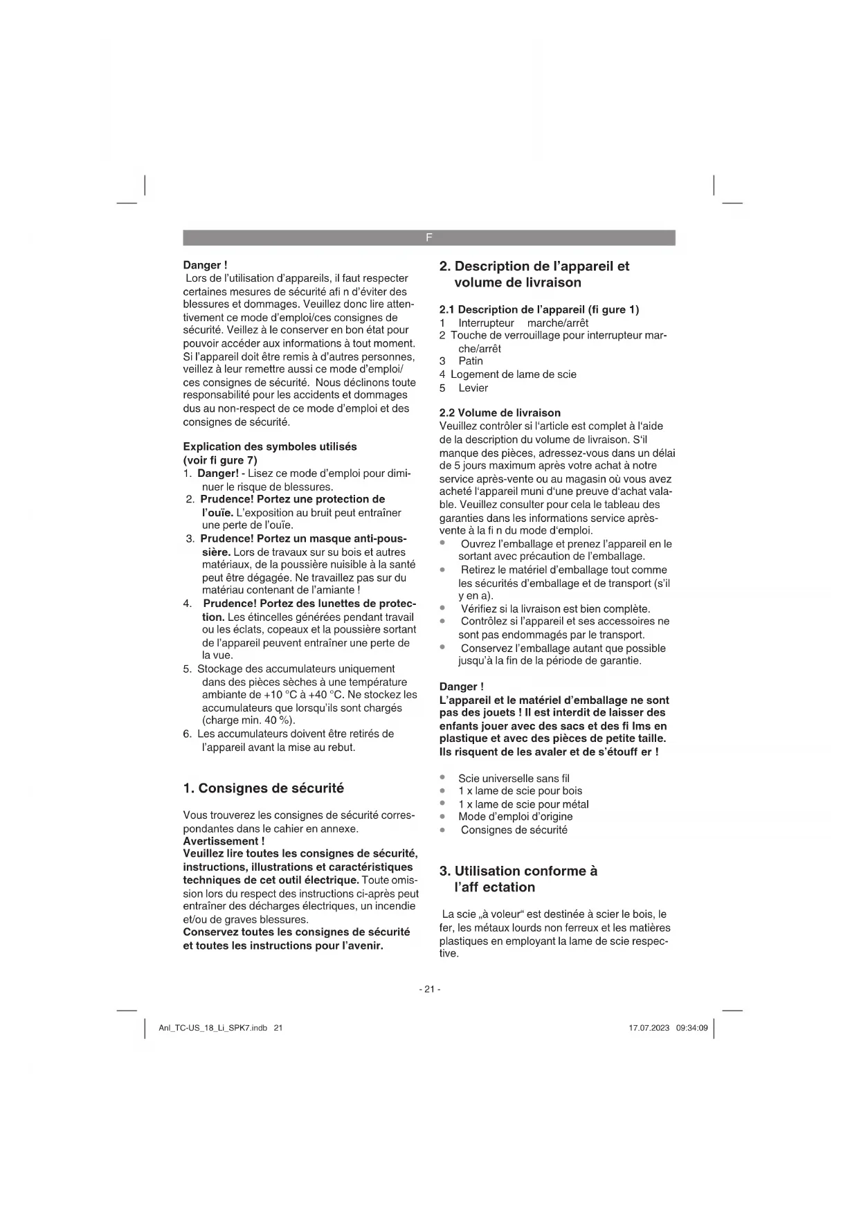 l’aff ectation La scie „à voleur“ est destinée à scier le bois, le fer, les métaux lourds non ferreux et les matières plastiques en employant la lame de scie respec- tive. Anl_TC-US_18_Li_SPK7.indb 21Anl_TC-US_18_Li_SPK7.indb 21 17.07.2023 09:34:0917.07.2023 09:34:09F