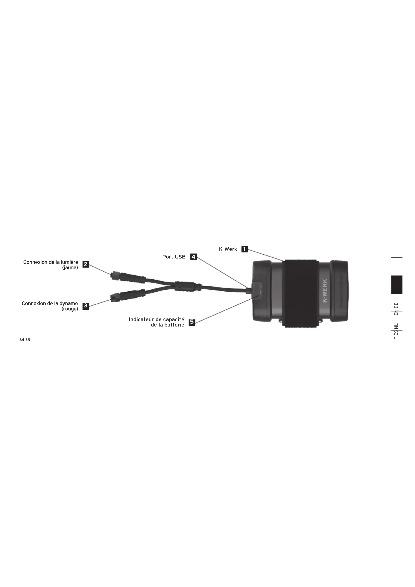Fixer le K-Werk 1 à l'aire de la sangle de fixation velocro à un endroit approprié du vélo, ou le ranger ailleurs en toute sécurité (par ex. dans une poche ou un maillot). Monter correctement et en toute sécurité l'accessoire saufaîque (par ex. le phare) et le relier au K-Werk 1 via la sortie d'éclairage 2 ou la sortie USB 4. Raccorder la sortie de la dynamo 3 à la dynamo de moyeu de votre vélo à l'aire du cable approprié. Si vous avez besoin d'aide pour cette opération, adressez-vous à un spécialiste du vélo pour qu'il effectue ces travaux correctement.