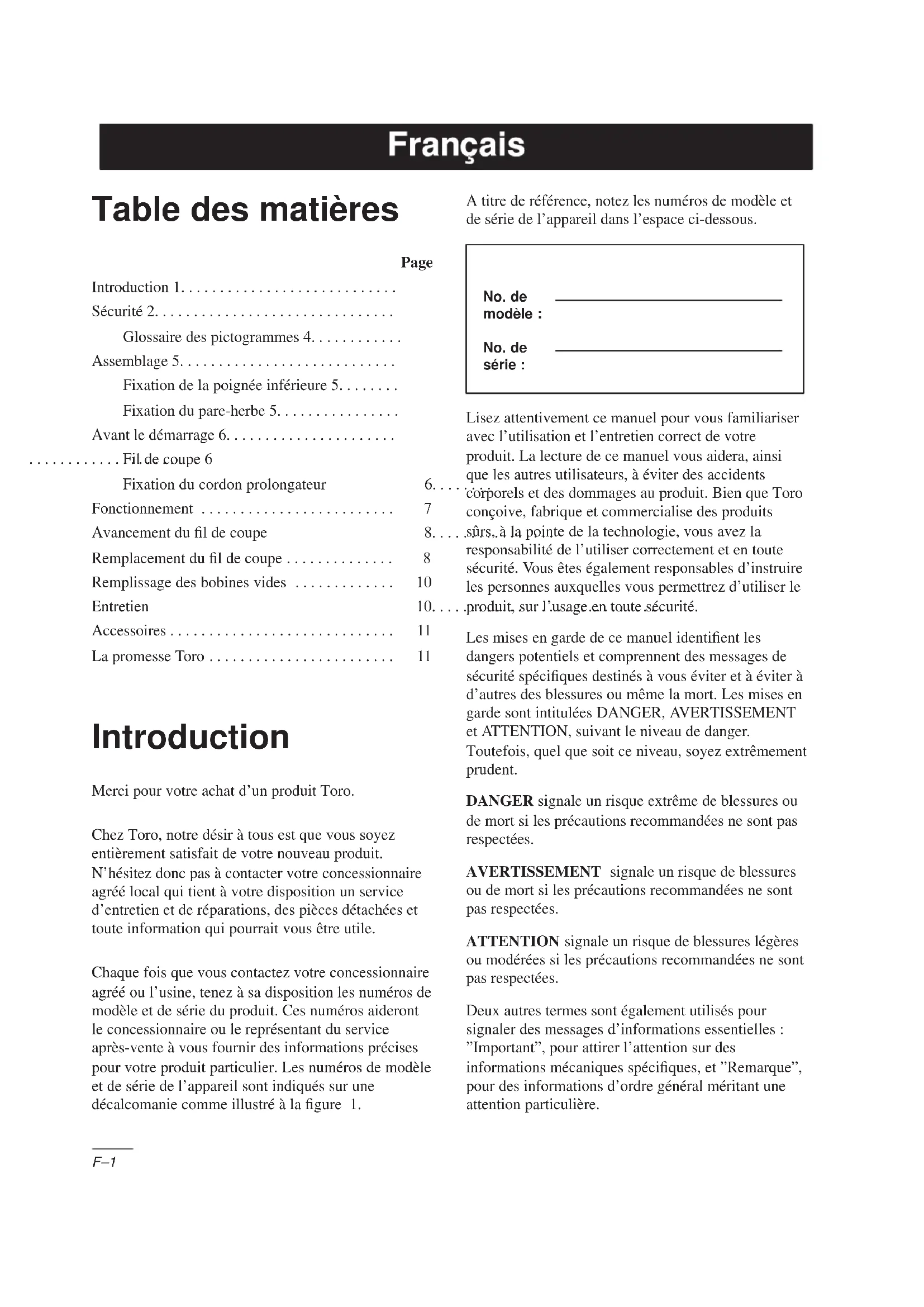 Model #88176 Part #73–8190 The Toro Promise A Full Two Year Residential Use Warranty The Toro Company warrants this TORO Product for two years against defects in material orworkmanship. To receive a replacement or repair, at Toro’s option, just return the completeunit, postage prepaid, to the Distributor (dealer) along with proof of purchase. This warranty covers product defects only. It does not cover incidental or consequential damages. This warranty gives you specific rights, and you may have other rights which vary from country tocountry. If all other remedies fail, you may contact us at The Toro Company, Dreve Richelle161, Batiment “C”, 1410 Waterloo, Belgium. (Do not return defective product to this address.)Français F–1 Table des matières Page Introduction 1... Sécurité 2... Glossaire des pictogrammes 4... Assemblage 5... Fixation de la poignée inférieure 5... Fixation du pare-herbe 5... Avant le démarrage 6... Fil de coupe 6... Fixation du cordon prolongateur 6... Fonctionnement 7... Avancement du fil de coupe 8... Remplacement du fil de coupe 8... Remplissage des bobines vides 10... Entretien 10... Accessoires 11... La promesse Toro 11... Introduction Merci pour votre achat d’un produit Toro. Chez Toro, notre désir à tous est que vous soyez entièrement satisfait de votre nouveau produit. N’hésitez donc pas à contacter votre concessionnaire agréé local qui tient à votre disposition un service d’entretien et de réparations, des pièces détachées et toute information qui pourrait vous être utile. Chaque fois que vous contactez votre concessionnaire agréé ou l’usine, tenez à sa disposition les numéros de modèle et de série du produit. Ces numéros aideront le concessionnaire ou le représentant du service après-vente à vous fournir des informations précises pour votre produit particulier. Les numéros de modèle et de série de l’appareil sont indiqués sur une décalcomanie comme illustré à la figure 1. A titre de référence, notez les numéros de modèle et de série de l’appareil dans l’espace ci-dessous. No. de modèle : No. de série : Lisez attentivement ce manuel pour vous familiariser avec l’utilisation et l’entretien correct de votre produit. La lecture de ce manuel vous aidera, ainsi que les autres utilisateurs, à éviter des accidents corporels et des dommages au produit. Bien que Toro conçoive, fabrique et commercialise des produits sûrs, à la pointe de la technologie, vous avez la responsabilité de l’utiliser correctement et en toute sécurité. Vous êtes également responsables d’instruire les personnes auxquelles vous permettrez d’utiliser le produit, sur l’usage en toute sécurité. Les mises en garde de ce manuel identifient les dangers potentiels et comprennent des messages de sécurité spécifiques destinés à vous éviter et à éviter à d’autres des blessures ou même la mort. Les mises en garde sont intitulées DANGER, AVERTISSEMENT et ATTENTION, suivant le niveau de danger. Toutefois, quel que soit ce niveau, soyez extrêmement prudent. DANGER signale un risque extrême de blessures ou de mort si les précautions recommandées ne sont pas respectées. AVERTISSEMENT signale un risque de blessures ou de mort si les précautions recommandées ne sont pas respectées. ATTENTION signale un risque de blessures légères ou modérées si les précautions recommandées ne sont pas respectées. Deux autres termes sont également utilisés pour signaler des messages d’informations essentielles : ”Important”, pour attirer l’attention sur des informations mécaniques spécifiques, et ”Remarque”, pour des informations d’ordre général méritant une attention particulière.F–2 Sécurité