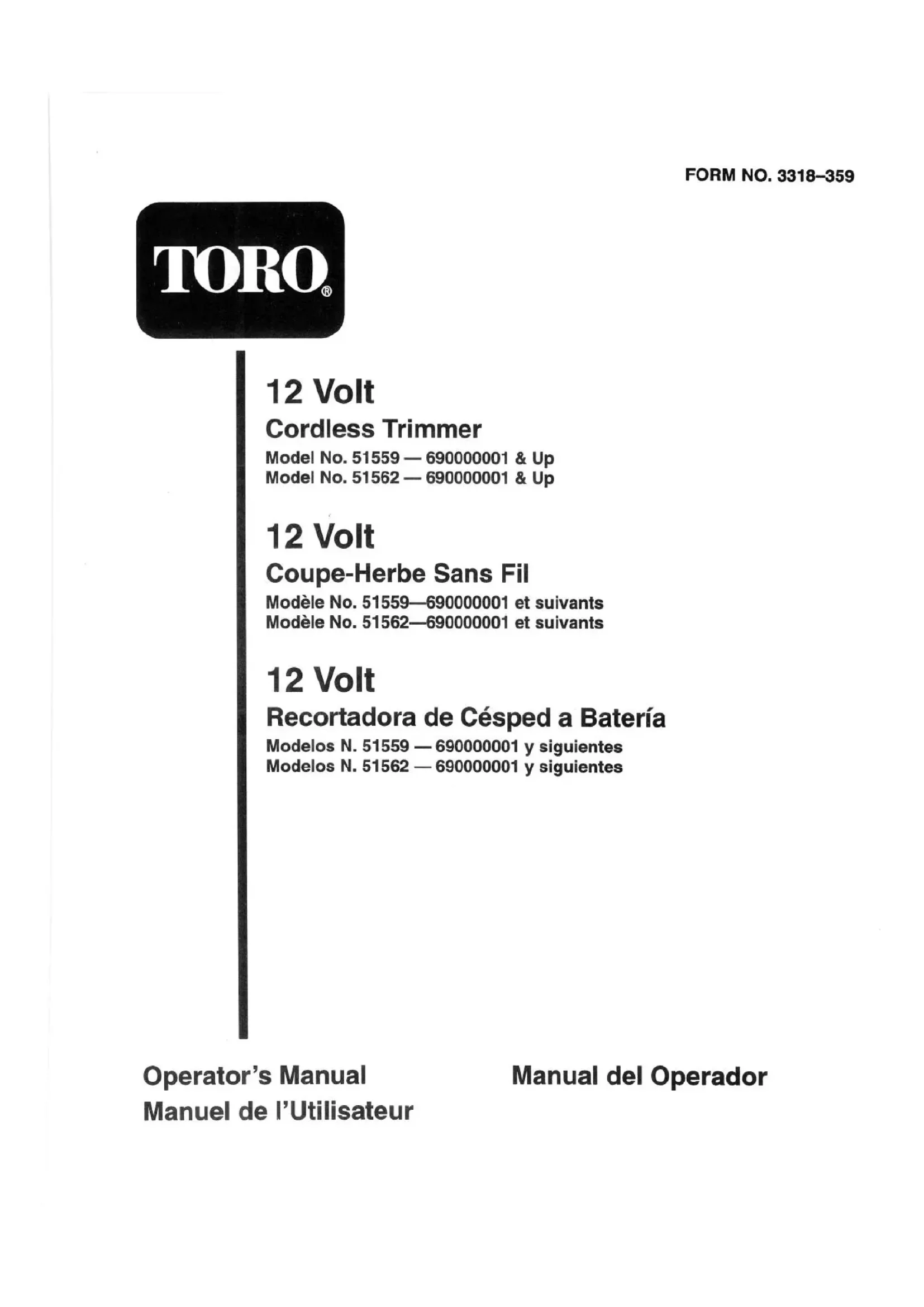 Téléchargez la notice de votre Coupe-herbe au format PDF gratuitement ! Retrouvez votre notice 51559 - TORO et reprennez votre appareil électronique en main. Sur cette page sont publiés tous les documents nécessaires à l'utilisation de votre appareil 51559 de la marque TORO.