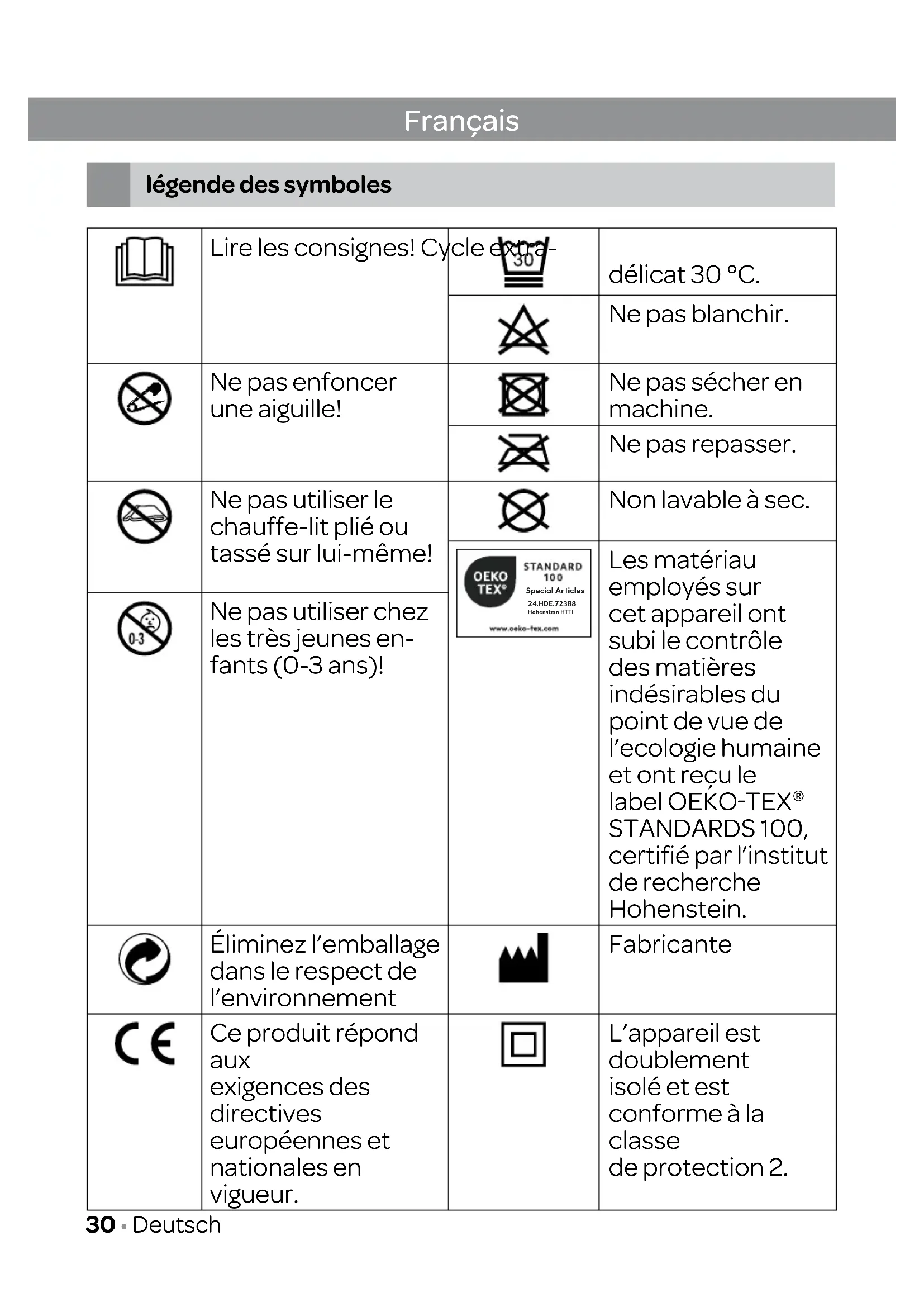 ![]() | Ne pas utiliser le chauffe-lit plié ou tassé sur lui-même! | ![]() | Non lavable à sec. |