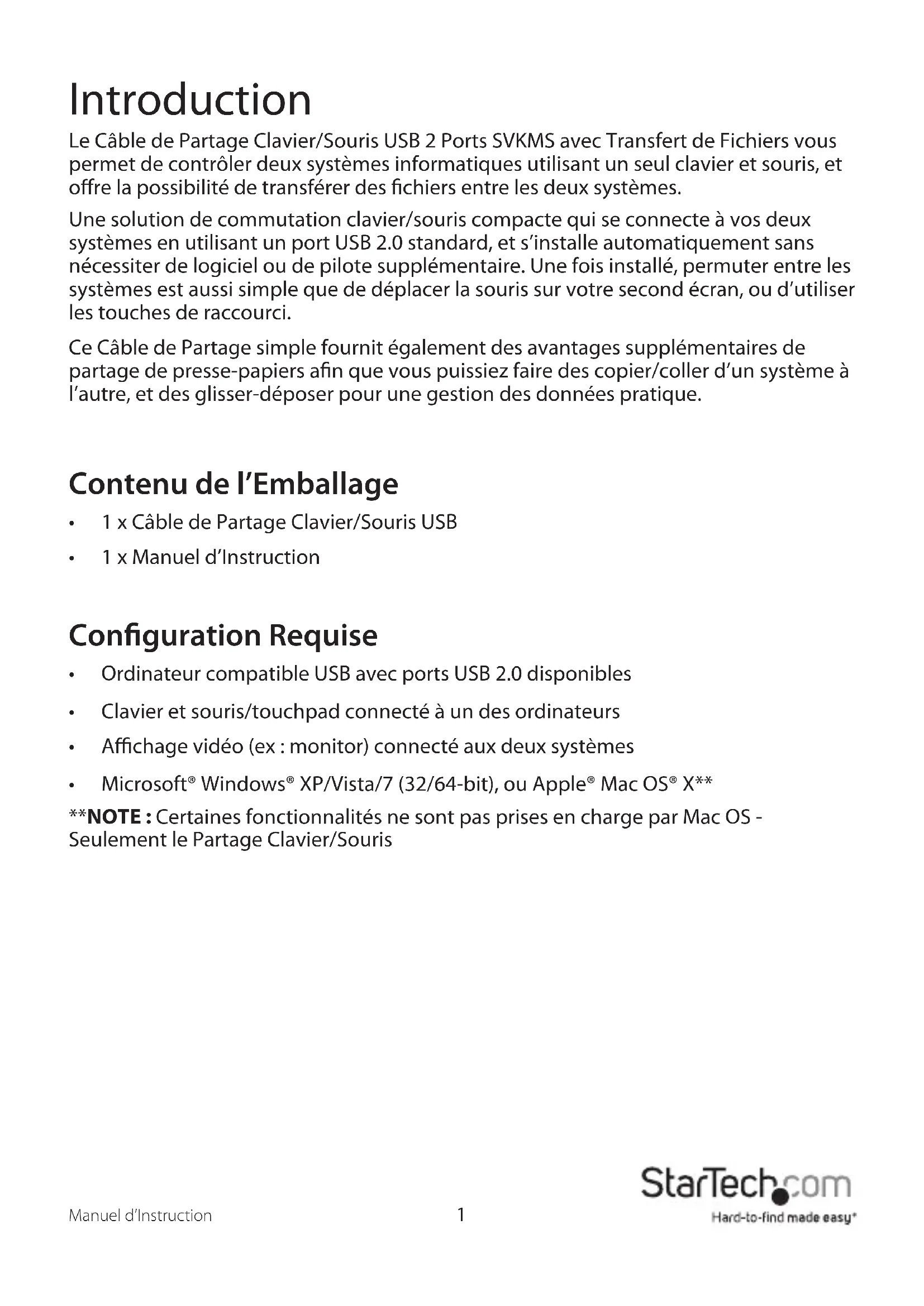 Révision du Manuel: 07/04/2012 Pour les informations les plus récentes, veuillez visiter www.startech.com DE: Bedienungsanleitung - de.startech.com FR: Guide de l'utilisateur - fr.startech.com ES: Guía del usuario - es.startech.com IT: Guida per l'uso - it.startech.com NL: Gebruiksaanwijzing - nl.startech.com PT: Guia do usuário - pt.startech.com *Le produit actuel peut varier de la photos SVKMS Câble de Partage Clavier/Souris USB 2 Ports avec Transfert de FichiersManuel d’Instruction Déclaration de conformité FCC Cet équipement a été testé et déclaré conforme en tant que dispositif numérique de classe B, conformément à la section 15 des règles FCC. Ces limites sont conçues pour fournir une protection raisonnable contre les interférences nuisibles dans une installation résidentielle. Cet équipement génère, utilise et peut émettre des fréquences radio et, s’il n’est pas installé et utilisé conformément aux instructions, il peut causer des interférences nuisibles aux communications radio. Cependant, il n’existe aucune garantie que des interférences ne se produiront pas dans une installation de type particulier. Si cet équipement provoque des interférences nuisibles à la réception de la radio ou de la télévision, pouvant être vérié en mettant l’équipement hors tension, l’utilisateur est encouragé à essayer de corriger l’interférence par une ou plusieurs des mesures suivantes: