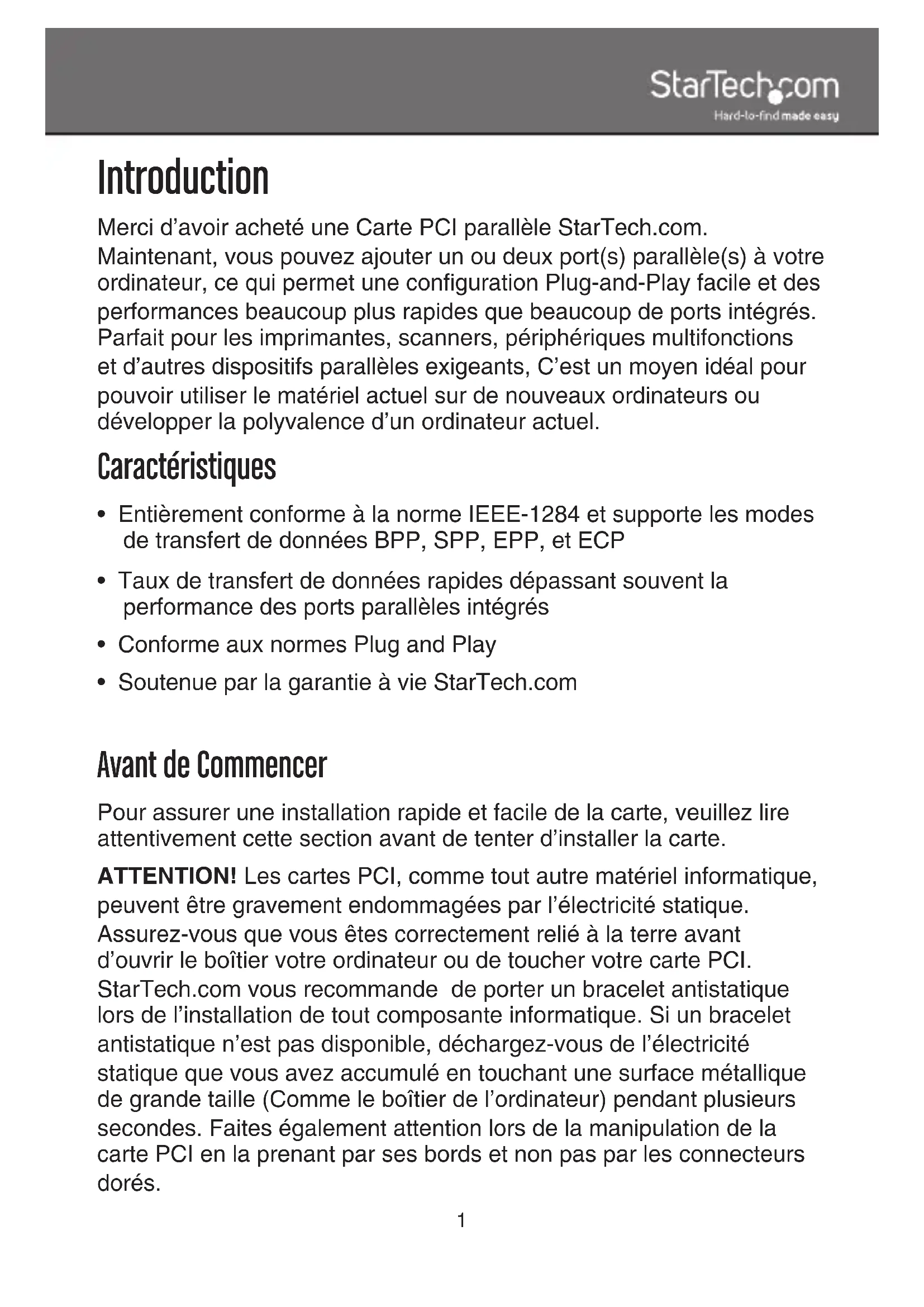 Merci d'avoir acheté une Carte PCI parallèle StarTech. com.