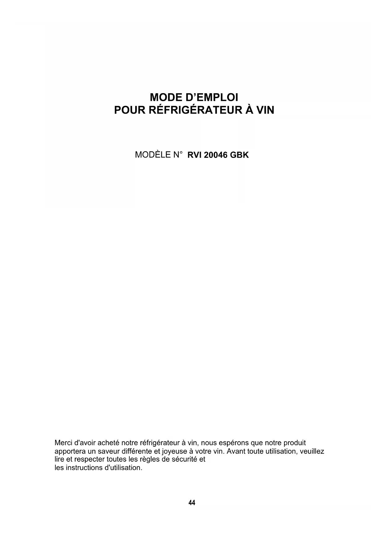Merci d'avoir acheté notre réfrigérateur à vin, nous espérons que notre produit apportera un saveur différente et joyeuse à votre vin. Avant toute utilisation, veuillez lire et respecter toutes les règles de sécurité et les instructions d'utilisation. 44MISE EN GARDE ! Pour éviter d'endommager le joint de la porte, assurez-vous que la porte est complètement ouverte lorsque vous retirez les étagères du compartiment des rails. L'appareil doit être positionné de manière à ce que la prise soit accessible. Débranchez le cordon électrique. Déplacez l’armoire vers à son emplacement final. Ne déplacez pas l’armoire lorsqu'elle est chargée en vin. Elle pourrait être déformée. La cave à vin doit être installée dans un endroit approprié afin d'éviter de toucher le compresseur avec la main. Il est nécessaire de surveiller les enfants pour s’assurer qu’ils ne jouent pas avec l’appareil. Si le cordon d'alimentation est endommagé, il doit être remplacé par le fabricant, son agent de service ou une personne de qualification similaire afin d'éviter tout danger. Cet appareil peut être utilisé par des enfants à partir de 8 ans et par des personnes aux capacités physiques, sensorielles ou mentales réduites ou manquant d'expérience et de connaissances si elles sont surveillées ou si elles ne jouent pas avec l'appareil. Les enfants ne doivent pas effectuer le nettoyage et l'entretien sans surveillance. Pour éviter la contamination du vin, veuillez respecter les consignes suivantes : - L'ouverture de la porte pendant de longues périodes peut provoquer une augmentation significative de la température dans les compartiments de l'appareil. - Nettoyer régulièrement les surfaces pouvant entrer en contact avec les bouteilles et les systèmes de drainage accessibles. - Si l'appareil de réfrigération reste vide pendant de longues périodes, éteignez-le, dégivrez- le, nettoyez-le, séchez-le et laissez la porte ouverte pour éviter la formation de moisissures à l’intérieur de l'appareil. - MISE EN GARDE : Veillez à ce que les ouvertures de ventilation, dans le boîtier de l'appareil ou dans la structure intégrée, ne soient pas obstruées. - MISE EN GARDE : N'utilisez pas de dispositifs mécaniques ou d'autres moyens pour accélérer le processus de dégivrage, autres que ceux recommandés par le fabricant. - MISE EN GARDE : Ne pas endommager le circuit de réfrigération. - MISE EN GARDE : N'utilisez pas d'appareils électriques à l'intérieur des compartiments de stockage du vin de l'appareil, sauf s'ils sont du type recommandé par le fabricant. Ne stockez pas de substances explosives telles que des bombes aérosols contenant un gaz propulseur inflammable dans cet appareil. Cet appareil est conçu pour un usage domestique et similaire, tel que : - les cuisines du personnel dans les magasins, les bureaux et autres environnements de travail ; - les maisons de ferme et par les clients des hôtels, des motels et d'autres environnements de type résidentiel ; - les environnements de type chambre d'hôtes ; - secteur de la restauration et applications semblables. - MISE EN GARDE : Pour éviter les risques dus à l’instabilité de l’appareil, il doit être monté conformément aux instructions.
