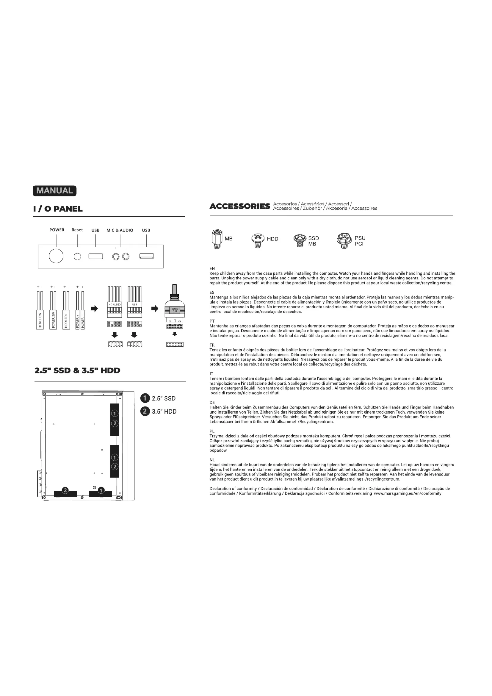 Tenez les enfants élognés des pieces du boitier lors de l'assemblage de l'ordinaire. Protégéez vos mains et vos doits lors de la manipulation et de l'installation des pieces. Débranche le cordon d'alimentation et nettoyez uniquement avec un chiffon sec, n'utilise pas de spray ou de nettoyants liquides. N'essayez pas de réparer le produit vous-même. À la fin de la durée de vie du produit, metteze-le au rebut dans cette centre local de collecte/recyclage des déchets.