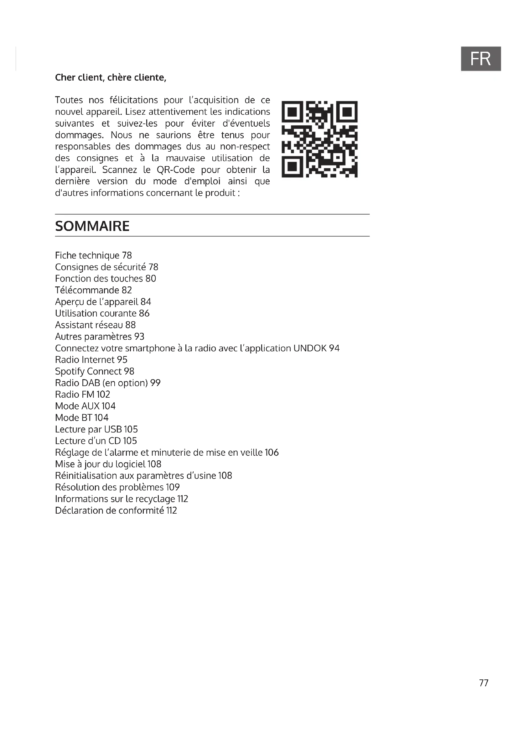 Cher client, chère cliente, Toutes nos félicitations pour l’acquisition de ce nouvel appareil. Lisez attentivement les indications suivantes et suivez-les pour éviter d'éventuels dommages. Nous ne saurions être tenus pour responsables des dommages dus au non-respect des consignes et à la mauvaise utilisation de l’appareil. Scannez le QR-Code pour obtenir la dernière version du mode d'emploi ainsi que d'autres informations concernant le produit: SOMMAIRE Fiche technique 78 Consignes de sécurité 78 Fonction des touches 80 Télécommande 82 Aperçu de l’appareil 84 Utilisation courante 86 Assistant réseau 88 Autres paramètres 93 Connectez votre smartphone à la radio avec l’application UNDOK 94 Radio Internet 95 Spotify Connect 98 Radio DAB (en option) 99 Radio FM 102 Mode AUX 104 Mode BT 104 Lecture par USB 105 Lecture d’un CD 105 Réglage de l’alarme et minuterie de mise en veille 106 Mise à jour du logiciel 108 Réinitialisation aux paramètres d’usine 108 Résolution des problèmes 109 Informations sur le recyclage 112 Déclaration de conformité 11278