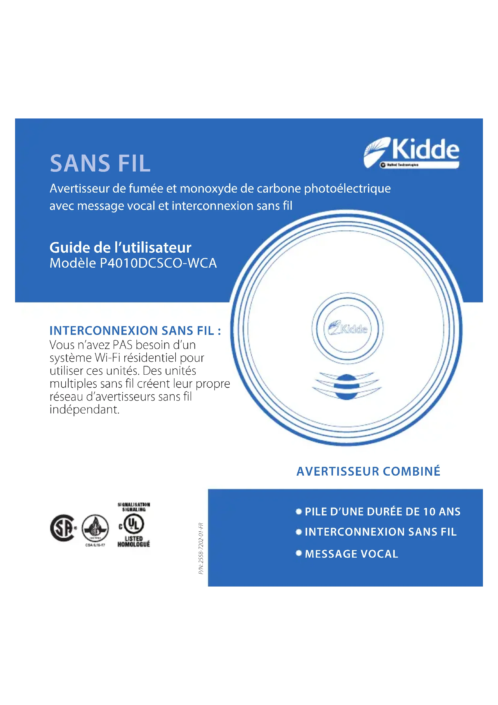 SANS FIL Avertisseur de fumée et monoxyde de carbone photoélectrique avec message vocal et interconnexion sans fil Guide de l’utilisateur Modèle P4010DCSCO-WCA INTERCONNEXION SANS FIL: Vous n’avez PAS besoin d’un système Wi-Fi résidentiel pour utiliser ces unités. Des unités multiples sans fil créent leur propre réseau d’avertisseurs sans fil indépendant. PILE D’UNE DURÉE DE 10 ANS INTERCONNEXION SANS FIL MESSAGE VOCAL AVERTISSEUR COMBINÉ P/N: 2558-7202-01-FR2 Merci d’avoir acheté cet avertisseur Kidde Ce modèle est muni d’une pile hermétique non remplaçable. Il comprend aussi un système de message vocal et une commande d’arrêt (Hush