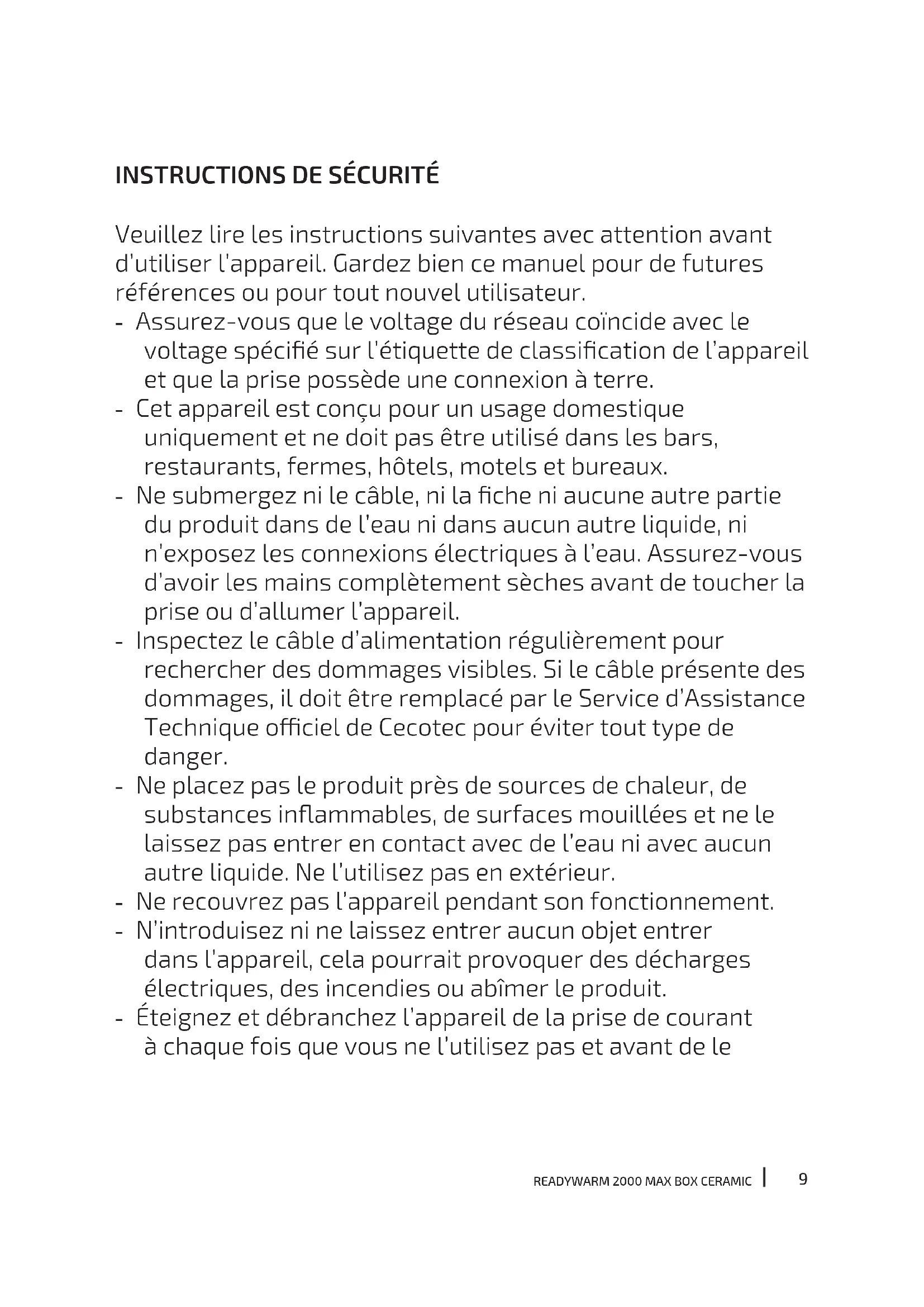 Veuillez lire les instructions suivantes avec attention avant d’utiliser l’appareil. Gardez bien ce manuel pour de futures références ou pour tout nouvel utilisateur. - Assurez-vous que le voltage du réseau coïncide avec le voltage spécié sur l’étiquette de classication de l’appareil et que la prise possède une connexion à terre. - Cet appareil est conçu pour un usage domestique uniquement et ne doit pas être utilisé dans les bars, restaurants, fermes, hôtels, motels et bureaux. - Ne submergez ni le câble, ni la che ni aucune autre partie du produit dans de l’eau ni dans aucun autre liquide, ni n’exposez les connexions électriques à l’eau. Assurez-vous d’avoir les mains complètement sèches avant de toucher la prise ou d’allumer l’appareil. - Inspectez le câble d’alimentation régulièrement pour rechercher des dommages visibles. Si le câble présente des dommages, il doit être remplacé par le Service d’Assistance Technique ociel de Cecotec pour éviter tout type de danger. - Ne placez pas le produit près de sources de chaleur, de substances inammables, de surfaces mouillées et ne le laissez pas entrer en contact avec de l’eau ni avec aucun autre liquide. Ne l’utilisez pas en extérieur. - Ne recouvrez pas l’appareil pendant son fonctionnement. - N’introduisez ni ne laissez entrer aucun objet entrer dans l’appareil, cela pourrait provoquer des décharges électriques, des incendies ou abîmer le produit. - Éteignez et débranchez l’appareil de la prise de courant à chaque fois que vous ne l’utilisez pas et avant de le 08281_READYWARM 2000 MAX BOX CERAMIC_RP_01230626.indd 908281_READYWARM 2000 MAX BOX CERAMIC_RP_01230626.indd 9 27/6/23 13:0727/6/23 13:0710