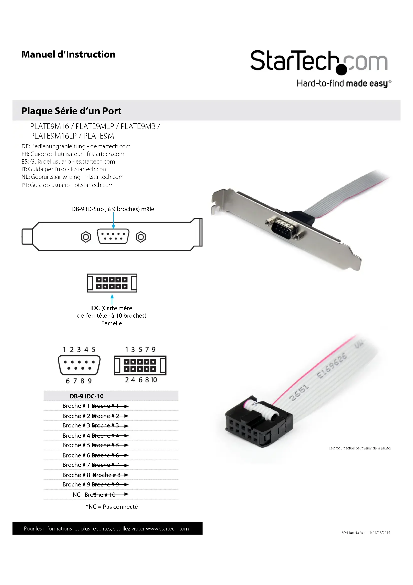 Plaque Série d’un Port *Le produit actuel peut varier de la photos DB-9 (D-Sub ; à 9 broches) mâle IDC (Carte mère de l’en-tête ; à 10 broches) Femelle DB-9 IDC-10 Broche # 1 Broche # 1 Broche # 2 Broche # 2 Broche # 3 Broche # 3 Broche # 4 Broche # 4 Broche # 5 Broche # 5 Broche # 6 Broche # 6 Broche # 7 Broche # 7 Broche # 8 Broche # 8 Broche # 9 Broche # 9 NC Broche # 10 *NC = Pas connectéDéclaration de conformité FCC Cet équipement a été testé et déclaré conforme en tant que dispositif numérique de classe B, conformément à la section 15 des règles FCC. Ces limites sont conçues pour fournir une protection raisonnable contre les interférences nuisibles dans une installation résidentielle. Cet équipement génère, utilise et peut émettre des fréquences radio et, s’il n’est pas installé et utilisé conformément aux instructions, il peut causer des interférences nuisibles aux communications radio. Cependant, il n’existe aucune garantie que des interférences ne se produiront pas dans une installation de type particulier. Si cet équipement provoque des interférences nuisibles à la réception de la radio ou de la télévision, pouvant être vérié en mettant l’équipement hors tension, l’utilisateur est encouragé à essayer de corriger l’interférence par une ou plusieurs des mesures suivantes: