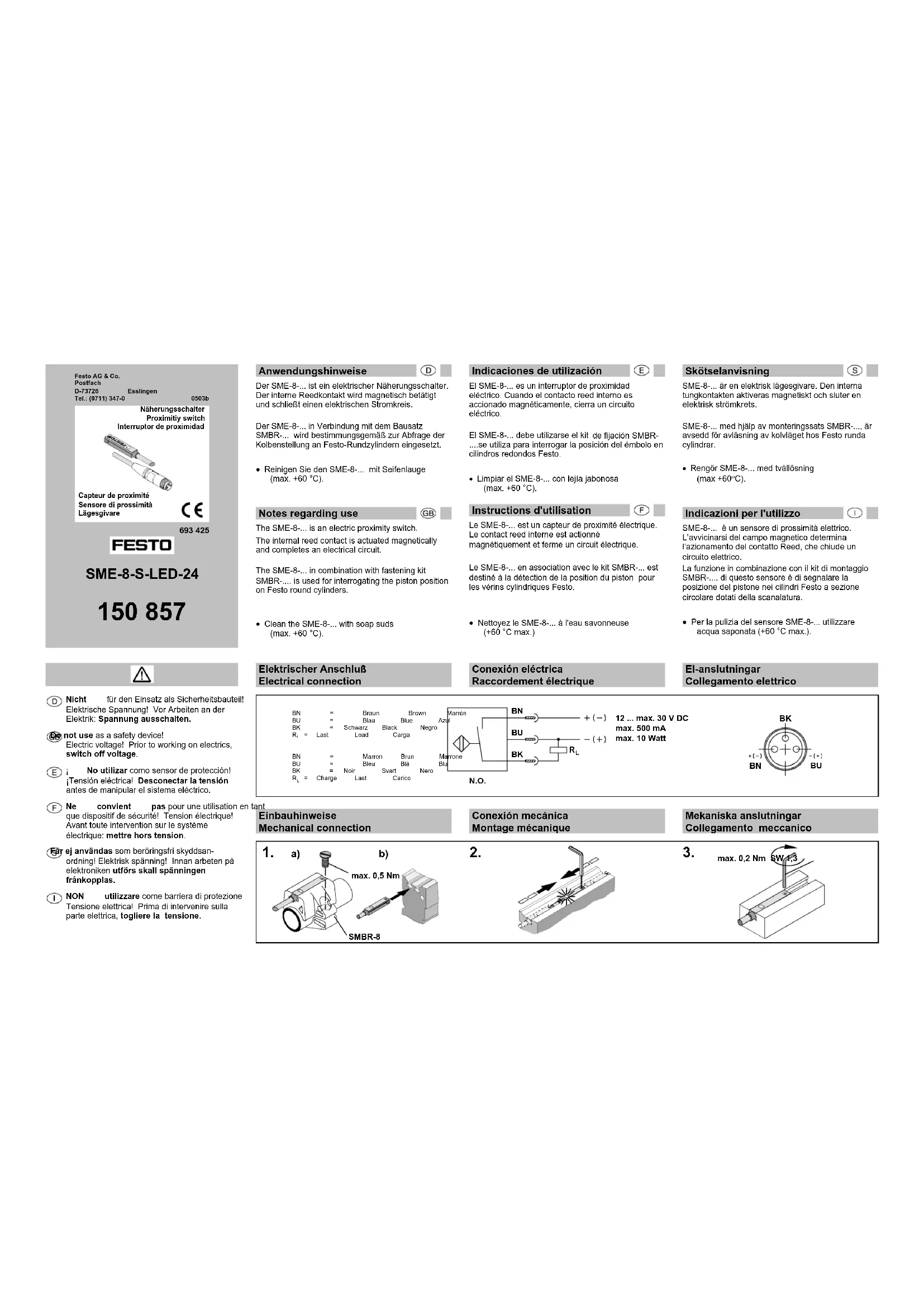 - Limpiar el SME-8-... con lejía jabonosa (max. +60 °C). Instructions d'utilisation Le SME-8-... est un capteur de proximité électrique. Le contact reed interne est actionné magnétiquement et ferme un circuit électrique. Le SME-8-... en association avec le kit SMBR-... est destiné à la détection de la position du piston pour les vérins cylindriques Festo.
