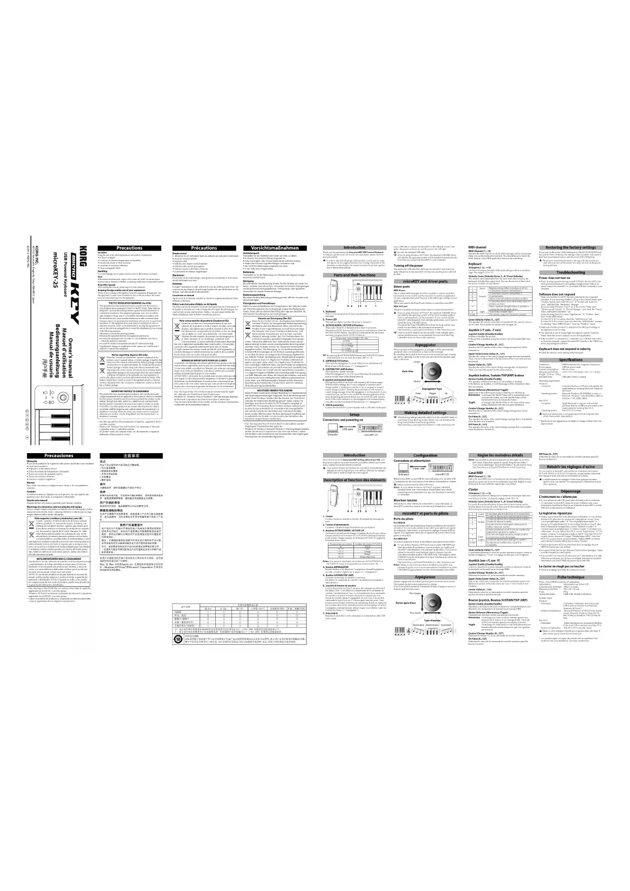 | Maintenance et réparation | Nettoyage régulier avec un chiffon doux, éviter l'exposition à l'humidité, pour les réparations, contacter un service agréé KORG. |