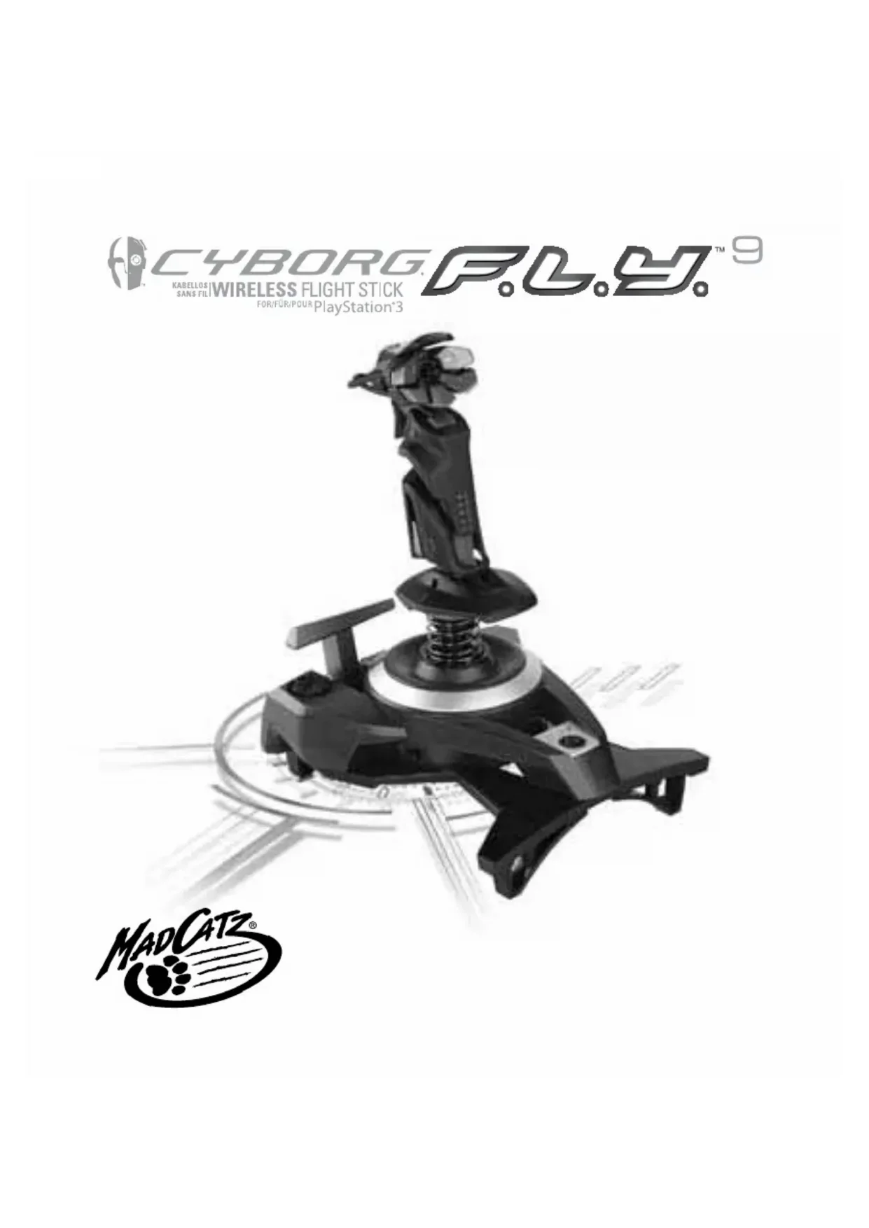 Exposition aux émissions de fréquences radio : La puissance des radiations émises par la manette se trouve dans les limites d’expositions aux fréquences radio imposées par la FCC, lorsque l’appareil n’est pas altéré et qu’il est utilisé conformé-[10] [11] ment aux instructions. De plus, la manette fonctionne selon les directives concernant les normes de sécurité sur les fréquences radio selon la communauté scientifi que. Le fabricant pense donc raisonnablement que les ondes sans fi l de l’appareil sont sans danger pour les consommateurs. Le niveau d’énergie émis est bien moins important que l’énergie électromagnétique émise par des appareils sans fi l comme les téléphones portables. Cependant, l’utilisation d’ondes sans fi l peut être restreinte dans certaines situations (dans les avions, par exemple). Si vous ne connaissez pas les restrictions qui peuvent s’appliquer dans certaines situations, demandez l’autorisation avant d’allumer, connecter ou utiliser la manette. ¥-AD#ATZ)NTERACTIVE!SIA,IMITED-#)!#YBORG&,9LELOGO#YBORG-AD#ATZETLELOGO-AD#ATZSONTDESMARQUESDECOMMERCEOUDESMARQUESDÏPOSÏESDE-AD#ATZ)NCETOUSES SOCIÏTÏSAFlLIÏES,AFORMEETLEDESIGNDECEPRODUITSONTCARACTÏRISTIQUESDELAMARQUE-AD#ATZETOU-#)!4OUTESLESAUTRESMARQUESOUMARQUESDÏPOSÏESSONTLAPROPRIÏTÏDELEURSPROPRIÏTAIRES respectifs. Fabriqué en Chine. Tous droits réservés. L’aspect, les fonctionnalités et les spécifications du produit peuvent changer sans préavis. Veuillez conserver cette notice pour référence ultérieure. « PlayStation » et le logo de la famille « PS » sont des marques déposées et « PS3 » est une marque de commerce de Sony Computer Entertainment Inc. ,ESACTIONSDE-AD#ATZSONTCOTÏESENBOURSESURLE438!-%8SOUSLESYMBOLE-#: Questions ? Visitez notre site Web www.madcatz.com ou appelez le +1.800.659.2287 (États-Unis uniquement) or +1.619.683.2815 ou +44 (0) 8450 508418 (Europe). 0RODUIT.O ESPAÑOL Cyborg F.L.Y. 9 Flight Stick de Inalambrico Gracias por adquirir el Cyborg F.L.Y. 9 Flight Stick de Inalambrico para su uso con el sistema de videojuego PlayStation 3. No se olvide de registrar en línea su producto en www.madcatz.com y examine nuestra completa gama de accesorios de calidad para videojuegos. ¡IMPORTANTE! Antes de usar la consola PlayStation 3 con este producto, lee el manual de instrucciones de la consola PlayStation 3 para obtener información sobre seguridad, salud y otros temas relacionados con el uso de la consola PlayStation 3. Todas las preguntas relativas a la consola deberán dirigirse al fabricante.