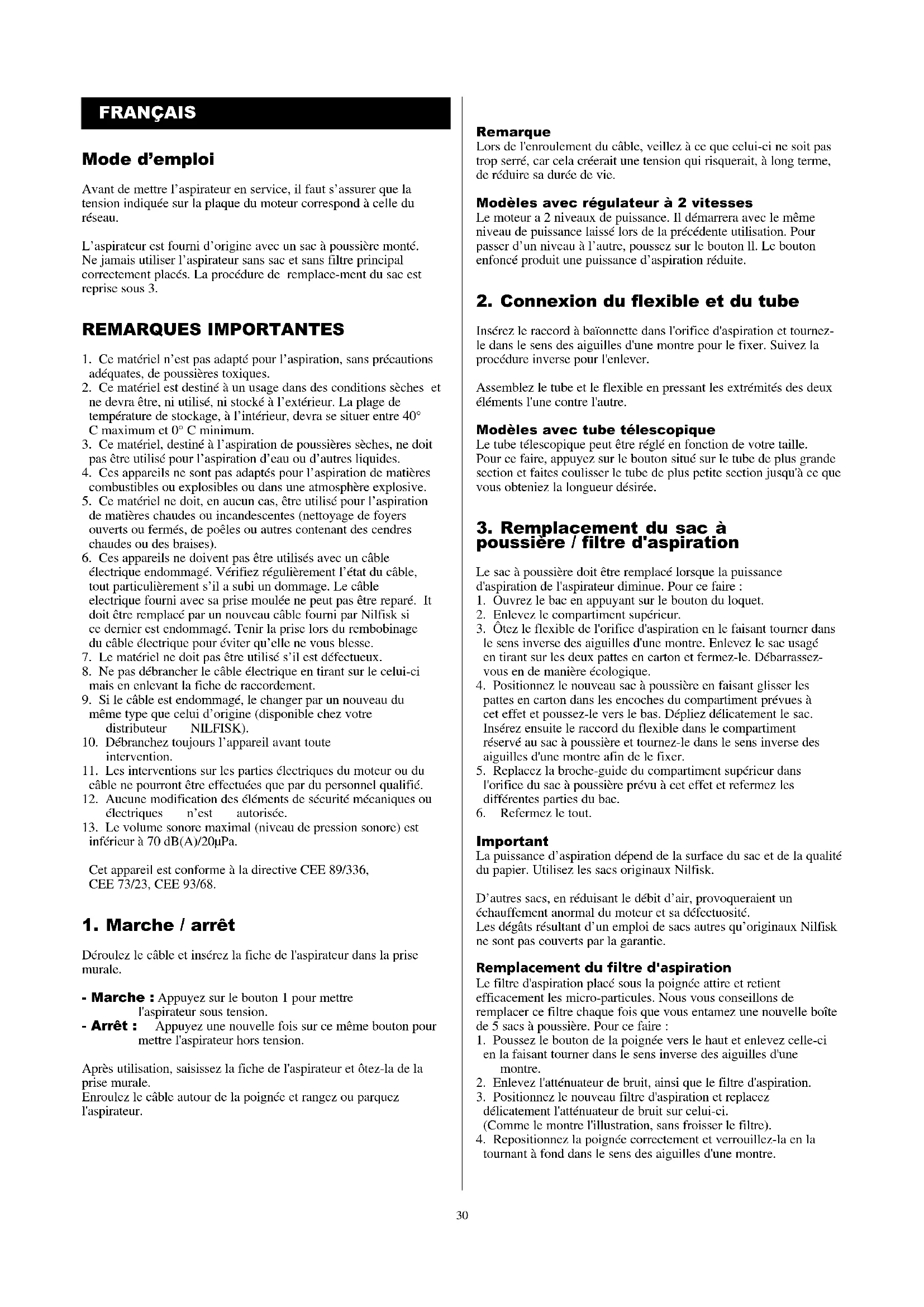 - L’aspirateur s’arrête – la sécurité thermique a coupé le moteur suite à une obstruction du tuyau flexible, du tube ou de l’embouchure (éliminer la cause de l’obstruction). Entretien Rangez l’appareil dans un endroit sec. Il n’y a pas lieu de graisser le moteur. Cependant, au bout d’un certain temps, suivant la fréquence d’utilisation, les filtres devront être changés. Nettoyez l’extérieur de l’appareil à l’aide d’un chiffon sec. Utilisez éventuellement un peu de nettoyant ménager. Pour le service après-vente, s’adresser directement à Nilfisk ou au distributeur agréé Nilfisk. Garantie pour usage domestique Les appareils Nilfisk sont construits à base des meilleurs matériaux et sont assemblés avec grande précision. Si, malgré cela, des défauts de fabrication au moteur devaient survenir dans les 3 ans (en Suisse 1 an) suivant l’achat, ceux-ci seraient réparés gratuitement. La période de garantie pour toutes les autres parties de l’aspirateur est de 1 an. Toutes les réparations dues à l’usure ne sont pas couvertes par la garantie. La garantie n’est pas valable si : – le voltage n’est pas respecté – l’appareil a été démonté par une tierce personne ne faisant pas partie du service Nilfisk – la panne est due à l’usage de sacs papier n’étant pas des sacs originaux Nilfisk (mention “ORIGINAL NILFISK” sur le sac) PS Toute autre garantie donnée en notre nom, soit par écrit, soit oralement, ne sera pas reconnue par Nilfisk.32 Remarques importantes (Electro Nozzle 2832) Avant de mettre l’appareil en service, il faut s’assurer que la tension indiquée sur la plaque du moteur correspond à celle du réseau. L’appareil ne peut pas être utilisé pour aspirer des matières dangereuses comme des poussières toxiques ou des matières inflammables ou explosives, de même qu’il ne peut pas être utilisé dans une atmosphère explosive. En aucune circonstance, l’appareil ne peut être utilisé pour aspirer des matières chaudes et, en particulier, pour nettoyer des foyers allumés ou éteints, des fours ou d’autres endroits similaires qui contiennent des cendres chaudes ou incandescentes. Evitez d’absorber des objets durs et pointus car ils pourraient endommager l’appareil. L’appareil ne peut pas être utilisé pour aspirer de l’eau, des liquides ou des vapeurs inflammables. Laissez sécher complètement les moquettes après un nettoyage humide avant de travailler avec l’appareil, sinon il risquerait d’être endommagé. L’appareil ne peut pas être utilisé si le câble électrique ou la fiche sont endommagés. Contrôlez régulièrement celui-ci. En cas de dommage, seuls NILFISK ou un distributeur agréé NILFISK peuvent procéder à la réparation. Ne pas toucher le câble électrique ou la prise avec les mains mouillées. Ne débranchez pas l’appareil en tirant sur le câble électrique mais en retirant la fiche elle-même. La fiche doit toujours être retirée de la prise murale avant de procéder à toute réparation de la machine ou du câble d’alimentation. Ne pas passer sur le câble d’alimentation de l’aspirateur. Ne jamais toucher l’électrobrosse avec les doigts pendant qu’il tourne. Aucune modification d’ordre mécanique, électrique ou thermique ne peut être apportée. Le niveau sonore maximum est inférieur à 70 dB(A)/20µPa. Cet appareil est conforme aux directives suivantes de la CEE: 73/23/CEE (Incluant amendement 93/68/CEE), directive concernant la basse tension - 89/336/CEE (Incluant amendement 92/31/CEE, 93/68/CEE), directive concernant la compatibilité électromagnétique. Mode d’emploi Rentrez le câble dans les attaches et fixez-le avec les clips sur le flexible (tuyau souple) et le tube, tout en tenant le câble d’alimentation sous la poignée. Branchez la fiche dans la prise de courant de l’appareil. La mise en marche s’effectue en allumant l’aspirateur. Retirez les morceaux assez gros tels que les restes de tissu, de papier, etc., du sol pour éviter que le cylindre ne se bloque. L’électrobosse est appropriée pour presque tous les tapis et sols lisses. L’électrobrosse ne peut être utilisée pour l’entretien des tapis dont les fibres dépassent 1 à 1,5 cm. Le systéme articulée de la brosse permet de le déplacer aisément dans n’importe quelle direction. Si le moteur s’arrête: Si le moteur de l’électrobrosse est en surchauffe, cela peut être causépar une obstruction de la brosse rotative. Arrêtez l’aspirateur, débranchez-le, laissez-le le moteur de l’électrobrosse refroidir et nettoyez-la comme décrit dans la section “nettoyage et entretien”, si nécessaire. L’électrobrosse peut être remise en service au bout de 2 minutes. Nettoyage et entretien Débranchez l’aspirateur, retirez la fiche de la prise de courant Ne jamais plonger l’électrobrosse dans l’eau ou dans un autre liquide pendant le nettoyage. Nettoyage du cylindre: Coupez tout simplement les cheveux et les fils qui se sont enroulés sur le cylindre avec des ciseaux et retirez ceux-ci (fig. 2). Démontage du cylindre de électrobrosse: Desserrez les crochets d’arrêts à l’aide d’un tournevis (fig. 3), ôtez le capot par l’avant. Retournez l’électrobrosse et retirez le couvercle du corps (fig. 5), démontez le cylindre de l’électrobrosse. Sortez le support du cylindre et nettoyez-le. Lors du remontage du cylindre, veillez bien à ajuster la courroie dentée sur les pignons. Remettez le capot en place et emboîtez-le en exerçant une pression régulière par le haut. Nettoyage des roulettes: Quand les roulettes de l’électrobrosse glissent mal, enlevez les cheveux ou les fils qui se sont enroulés autour des axes des roulettes. Il est possible de retirer les roulettes pour les nettoyer. Il suffit de les ôter avec un objet solide (tournevis) - en tenant compte du sens des flèches. Introduisez le tournevis (fig. 4) dans la f