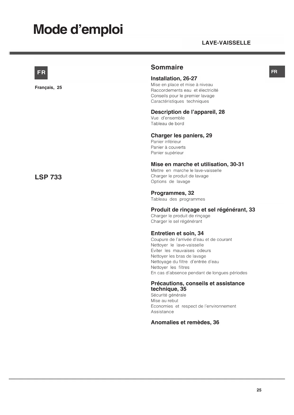 Mode demploi Sommaire Installation, 26-27 Mise en place et mise à niveau Raccordements eau et électricité Conseils pour le premier lavage Caractéristiques techniques Description de lappareil, 28 Vue densemble Tableau de bord Charger les paniers, 29 Panier inférieur Panier à couverts Panier supérieur Mise en marche et utilisation, 30-31 Mettre en marche le lave-vaisselle Charger le produit de lavage Options de lavage Programmes, 32 Tableau des programmes Produit de rinçage et sel régénérant, 33 Charger le produit de rinçage Charger le sel régénérant Entretien et soin, 34 Coupure de larrivée deau et de courant Nettoyer le lave-vaisselle Eviter les mauvaises odeurs Nettoyer les bras de lavage Nettoyage du filtre dentrée deau Nettoyer les filtres En cas dabsence pendant de longues périodes Précautions, conseils et assistance technique, 35 Sécurité générale Mise au rebut Economies et respect de lenvironnement Assistance Anomalies et remèdes, 36 Français, 25