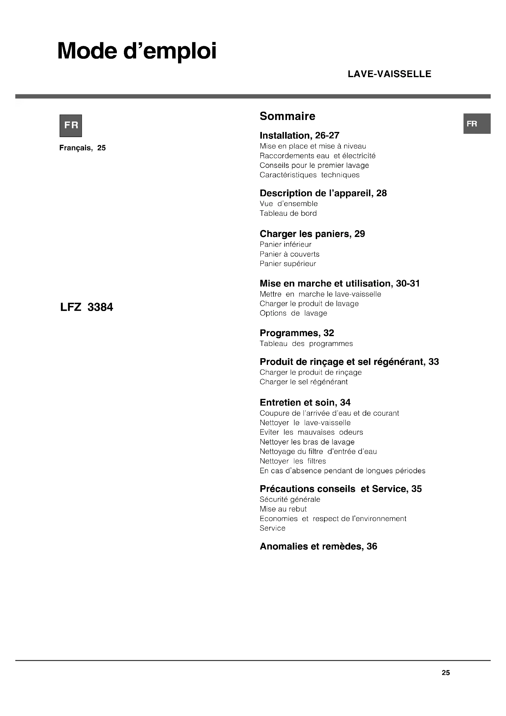 Mode demploi Sommaire Installation, 26-27 Mise en place et mise à niveau Raccordements eau et électricité Conseils pour le premier lavage Caractéristiques techniques Description de lappareil, 28 Vue densemble Tableau de bord Charger les paniers, 29 Panier inférieur Panier à couverts Panier supérieur Mise en marche et utilisation, 30-31 Mettre en marche le lave-vaisselle Charger le produit de lavage Options de lavage Programmes, 32 Tableau des programmes Produit de rinçage et sel régénérant, 33 Charger le produit de rinçage Charger le sel régénérant Entretien et soin, 34 Coupure de larrivée deau et de courant Nettoyer le lave-vaisselle Eviter les mauvaises odeurs Nettoyer les bras de lavage Nettoyage du filtre dentrée deau Nettoyer les filtres En cas dabsence pendant de longues périodes Précautions conseils et Service, 35 Sécurité générale Mise au rebut Economies et respect de lenvironnement Service Anomalies et remèdes, 36 Français, 25