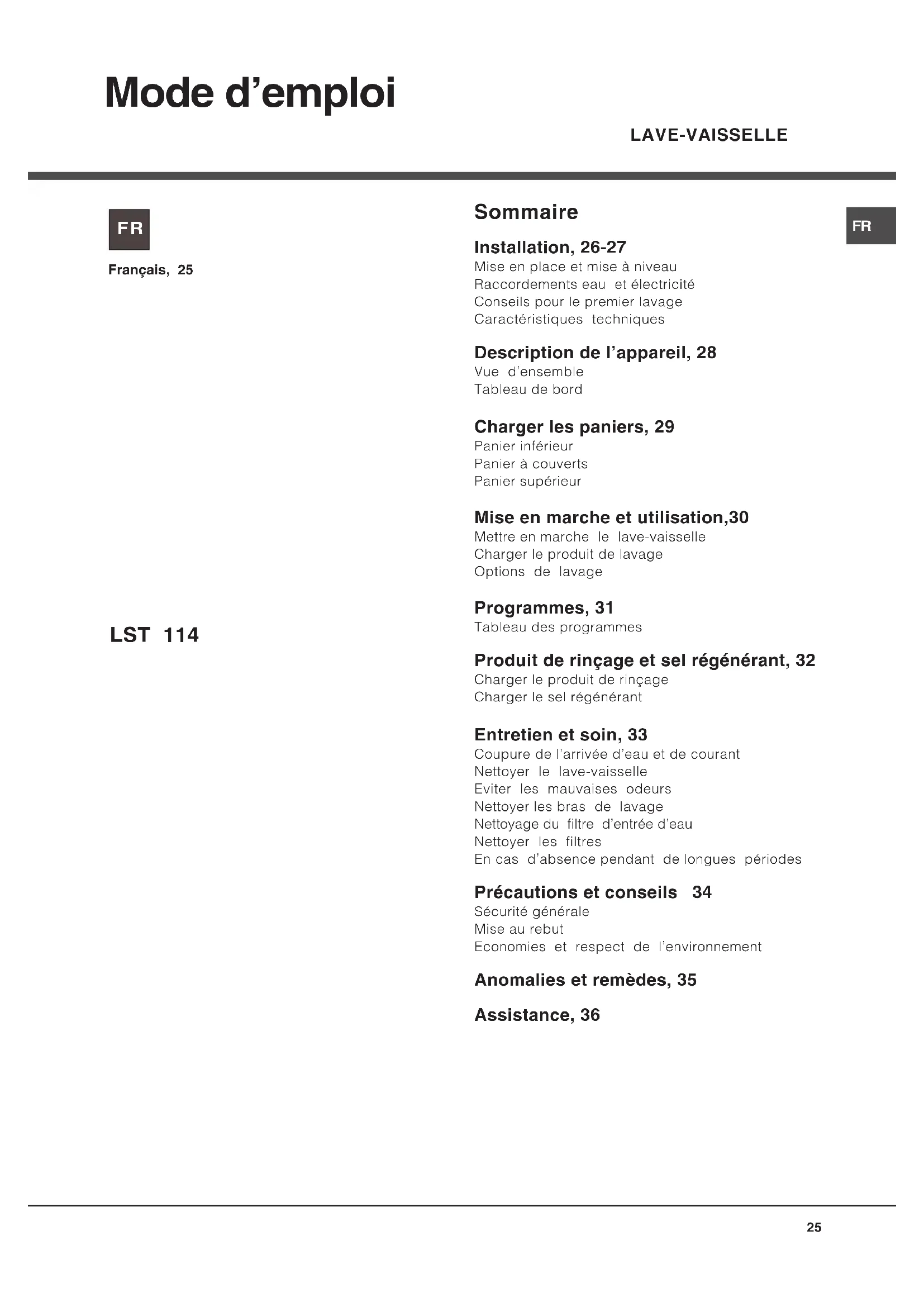Mode demploi Sommaire Installation, 26-27 Mise en place et mise à niveau Raccordements eau et électricité Conseils pour le premier lavage Caractéristiques techniques Description de lappareil, 28 Vue densemble Tableau de bord Charger les paniers, 29 Panier inférieur Panier à couverts Panier supérieur Mise en marche et utilisation,30 Mettre en marche le lave-vaisselle Charger le produit de lavage Options de lavage Programmes, 31 Tableau des programmes Produit de rinçage et sel régénérant, 32 Charger le produit de rinçage Charger le sel régénérant Entretien et soin, 33 Coupure de larrivée deau et de courant Nettoyer le lave-vaisselle Eviter les mauvaises odeurs Nettoyer les bras de lavage Nettoyage du filtre dentrée deau Nettoyer les filtres En cas dabsence pendant de longues périodes Précautions et conseils 34 Sécurité générale Mise au rebut Economies et respect de lenvironnement Anomalies et remèdes, 35 Assistance, 36 Français, 25