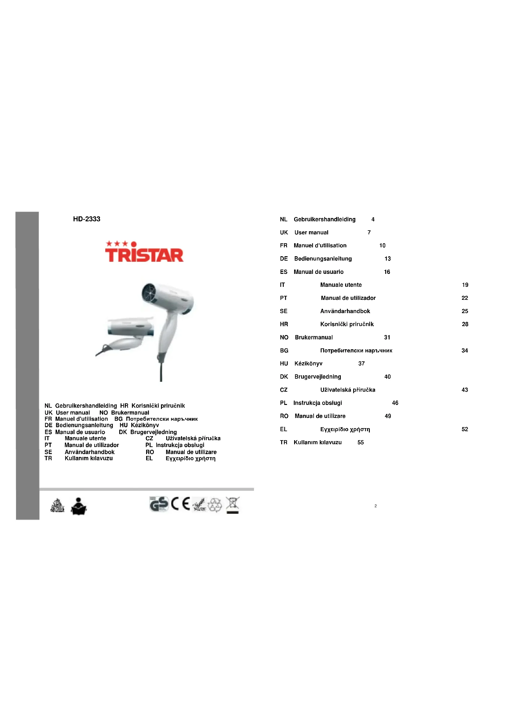 HD2333 - Sèche-cheveux TRISTAR - Notice d'utilisation et mode d'emploi gratuit