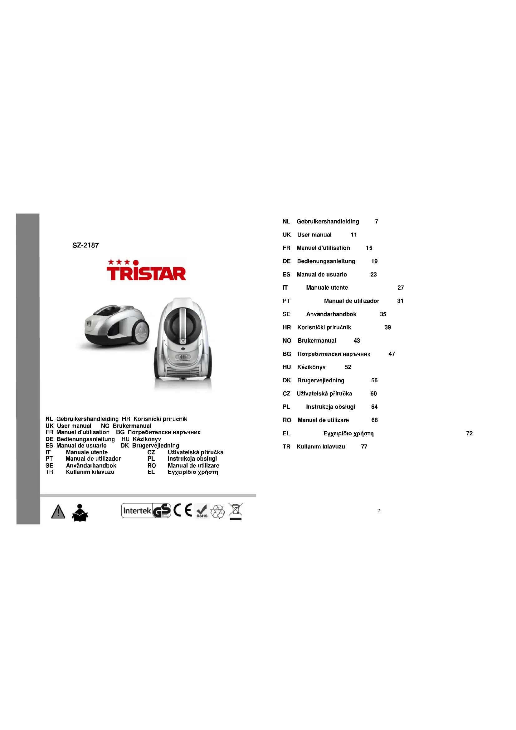 SZ2187 - Aspirateur TRISTAR - Notice d'utilisation et mode d'emploi gratuit