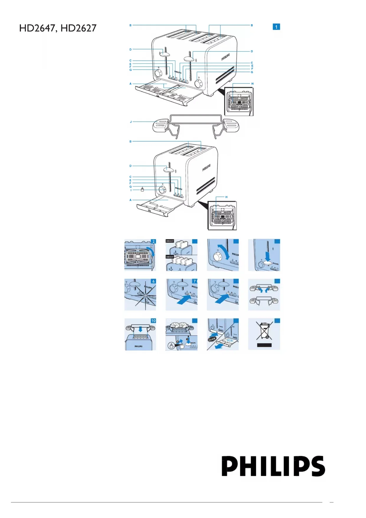 4222.002.6993.1Problem Solution The toast is too dark/too light. Check the browning setting selected for toasting. Select a lower setting next time if your toast is too dark and a higher setting if your toast is too light. Smoke comes out of the toaster. You have chosen a too high setting for the type of bread inserted. Push the stop button to stop the toasting process. The mains cord is damaged. If the mains cord of this appliance is damaged, it must always be replaced by Philips, a service centre authorised by Philips or similarly qualied persons in order to avoid a hazard. The bread pops up almost immediately without having been toasted Make sure you push down the toasting lever all the way. If the bread still does not stay down, take the appliance to a service centre authorized by Philips for examination. I cannot change the browning level when I use the warming function. This is normal, for the toaster has a xed temperature setting for warming up rolls and croissants, which guarantees a perfect end result. Only one side of my roll or croissant is warm Turn your roll or croissant and warm it up again. Follow the instructions in ‘Warming up rolls and croissants’. 4222.002.6993.1FRANÇAIS Introduction Félicitations pour votre achat et bienvenue dans l’univers Philips ! Pour proter pleinement de l’assistance Philips, enregistrez vos produits sur le site à l’adresse suivante : www.philips.com/welcome. Description générale (fig. 1) A Ramasse-miettes B Fentes de brunissage C Manette de brunissage D Bouton de réchauffage E Bouton de décongélation Ñ F Bouton d’arrêt G Réglage du brunissage H Crochets de rangement du cordon I Thermostat ó (HD2627 uniquement) J Grille de réchauffage (HD2627 uniquement) Important Lisez attentivement ce mode d’emploi avant d’utiliser l’appareil et conservez-le pour un usage ultérieur. Danger Ne plongez jamais l’épilateur dans l’eau. N’introduisez pas de tranches de pain trop grandes ou de la nourriture emballée dans de l’aluminium car vous risqueriez de provoquer un incendie ou de vous électrocuter. Avertissement Avant de brancher l’appareil, vériez que la tension indiquée sur le socle correspond à la tension secteur locale. Cet appareil n’est pas destiné à être utilisé par des personnes (notamment des enfants) dont les capacités physiques, sensorielles ou intellectuelles sont réduites, ou par des personnes manquant d’expérience ou de connaissances, à moins que celles-ci ne soient sous surveillance ou qu’elles aient reçu des instructions quant à l’utilisation de l’appareil par une personne responsable de leur sécurité. Veillez à ce que les enfants ne puissent pas jouer avec l’appareil. Ne laissez jamais l’appareil fonctionner sans surveillance. N’utilisez pas l’appareil à proximité de matériaux inammables tels que des tentures. Ne faites pas fonctionner l’appareil sous des placards suspendus (risque d’incendie). Ne placez jamais le couvercle (certains modèles uniquement) ou tout autre objet sur le grille-pain lorsque celui-ci est allumé ou encore chaud. Vous risqueriez d’endommager l’appareil ou de provoquer un incendie. Pour éviter tout risque d’incendie, retirez fréquemment les miettes du ramasse-miettes. Replacez correctement le ramasse-miettes. Débranchez immédiatement le grille-pain si vous observez de la fumée ou des ammes. Tenez le cordon secteur à l’écart des surfaces chaudes. Si le cordon d’alimentation est endommagé, il doit être remplacé par Philips, un Centre Service Agréé ou un technicien qualié an d’éviter tout accident. An d’éviter tout risque d’accident, utilisez cet appareil uniquement pour griller du pain. Attention Ne laissez pas le cordon pendre de la table ou du plan de travail sur lequel l’appareil est posé. Évitez de toucher les parties métalliques du grille- pain car, en cours de fonctionnement, celles-ci chauffent et atteignent des températures élevées. Ne touchez que les boutons et lorsque vous manipulez l’appareil, veillez à ne toucher que les parties en plastique latérales. Ne placez jamais le grille-pain sur une surface chaude. Branchez l’appareil uniquement sur une prise murale mise à la terre. Débranchez toujours l’appareil après utilisation. Ce grille-pain est destiné à un usage domestique intérieur uniquement. Il ne convient pas pour un usage commercial ou industriel. Si une tranche de pain reste coincée, débranchez le grille-pain et laissez-le refroidir complètement avant d’essayer de retirer le pain. N’insérez jamais