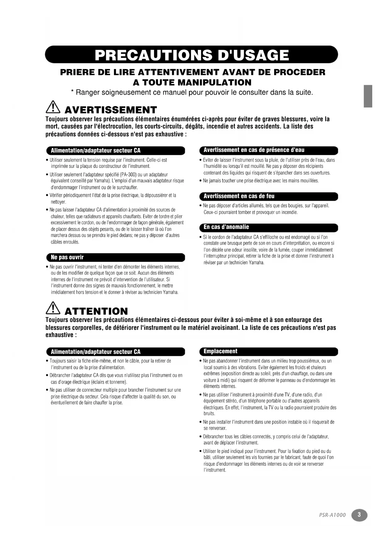 - Toujours saisir la fiche elle-même, et non le câble, pour la retirer de l'instrument ou de la prise d'alimentation. • Débrancher l'adaptateur CA dès que vous n'utilisez plus l'instrument ou en cas d'orage électrique (éclairs et tonnerre). • Ne pas utiliser de connecteur multiple pour brancher l'instrument sur une prise électrique du secteur. Cela risque d'affecter la qualité du son, ou éventuellement de faire chauffer la prise. • Ne pas abandonner l'instrument dans un milieu trop poussiéreux, ou un local soumis à des vibrations. Eviter également les froids et chaleurs extrêmes (exposition directe au soleil, près d'un chauffage, ou dans une voiture à midi) qui risquent de déformer le panneau ou d'endommager les éléments internes.• Ne pas utiliser l'instrument à proximité d'une TV, d'une radio, d'un équipement stéréo, d'un téléphone portable ou d'autres appareils électriques. En effet, l'instrument, la TV ou la radio pourraient produire des bruits.• Ne pas installer l'instrument dans une position instable où il risquerait de se renverser. • Débrancher tous les câbles connectés, y compris celui de l'adaptateur, avant de déplacer l'instrument. • Utiliser le pied indiqué pour l'instrument. Pour la fixation du pied ou du bâti, utiliser seulement les vis fournies par le fabricant, faute de quoi l'on risque d'endommager les éléments internes ou de voir se renverser l'instrument. Alimentation/adaptateur secteur CANe pas ouvrirAvertissement en cas de présence d'eauAvertissement en cas de feuEn cas d'anomalieAlimentation/adaptateur secteur CAEmplacementPSR-A1000