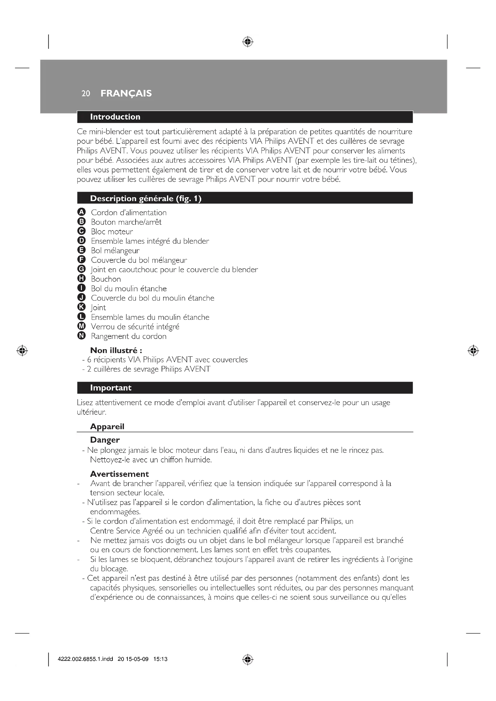 - 6 récipients VIA Philips AVENT avec couvercles - 2 cuillères de sevrage Philips AVENT Important Lisez attentivement ce mode d’emploi avant d’utiliser l’appareil et conservez-le pour un usage ultérieur.