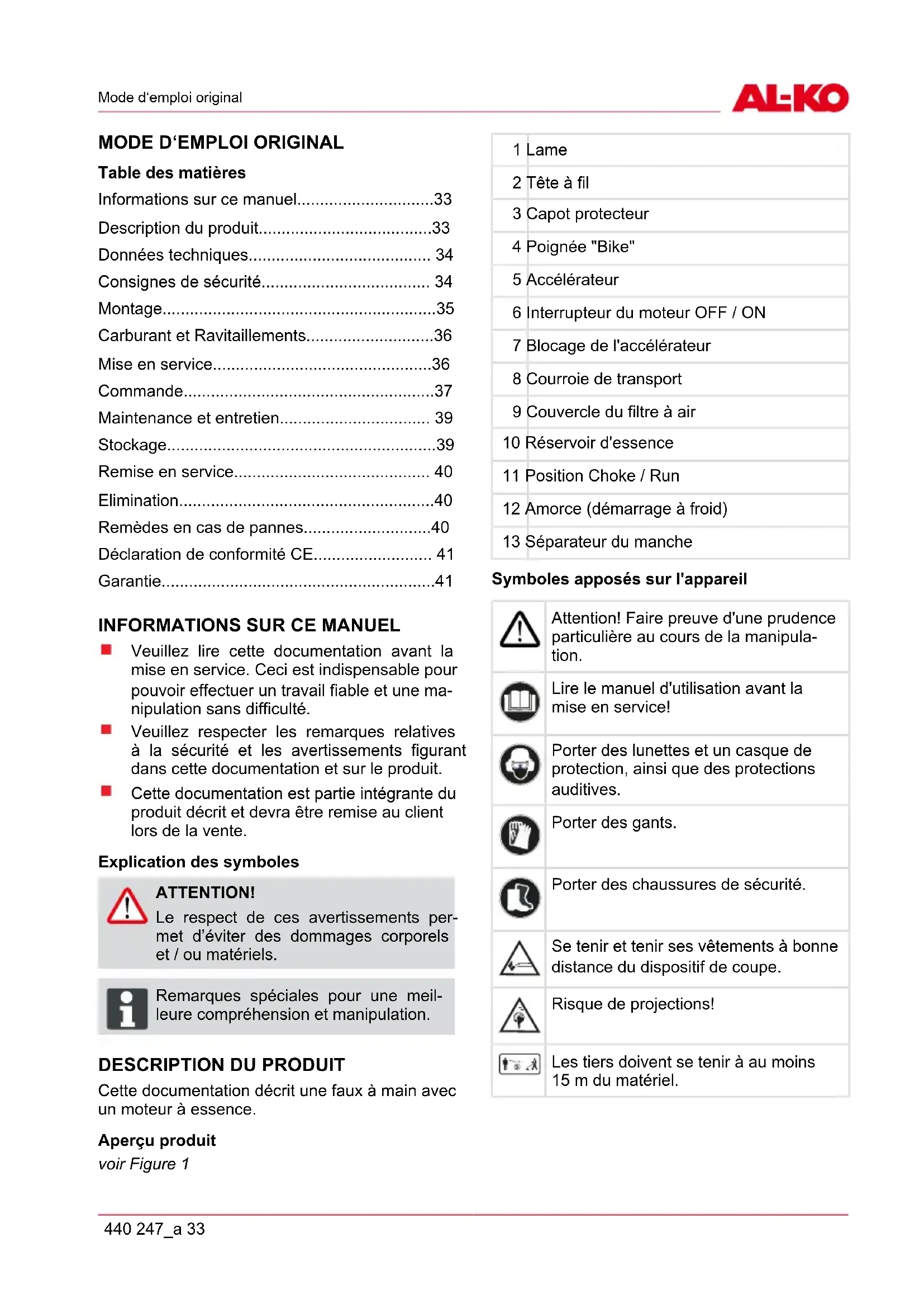 Cette documentation décrit une faux à main avec un moteur à essence. Aperçu produit voir Figure 1 1 Lame 2 Tête à fil 3 Capot protecteur 4 Poignée "Bike" 5 Accélérateur 6 Interrupteur du moteur OFF / ON 7 Blocage de l'accélérateur 8 Courroie de transport 9 Couvercle du filtre à air 10 Réservoir d'essence 11 Position Choke / Run 12 Amorce (démarrage à froid) 13 Séparateur du manche Symboles apposés sur l'appareil Attention! Faire preuve d'une prudence particulière au cours de la manipula- tion. Lire le manuel d'utilisation avant la mise en service! Porter des lunettes et un casque de protection, ainsi que des protections auditives. Porter des gants. Porter des chaussures de sécurité. Se tenir et tenir ses vêtements à bonne distance du dispositif de coupe. Risque de projections! 15m(50ft) Les tiers doivent se tenir à au moins 15 m du matériel.fr Description du produit 34 BC 4535 II-S Dispositifs de sécurité et de protection Arrêt d'urgence En cas d'urgence, positionner le contact d'allumage sur STOP. Ecran de protection contre les projections de pierre Protège l'utilisateur des projections. La lame inté- grée raccourcit le fil coupant à la longueur autori- sée. ATTENTION! Risque de blessure! Ne pas mettre les dispositifs de sécurité et de protection hors service. Séparateur du manche Le séparateur situé sur le manche vous permet de monter les capteurs du moteur en toute simplicité, de les démonter après la tonte et de les stocker dans un espace restreint. Utilisation conforme aux fins prévues Ce matériel sert à tailler et à tondre les pelouses des particuliers. Toute autre application est con- sidérée comme non conforme aux dispositions. Éventuelle utilisation non conforme ATTENTION! Cet appareil n'est pas approprié pour les utilisations industrielles.