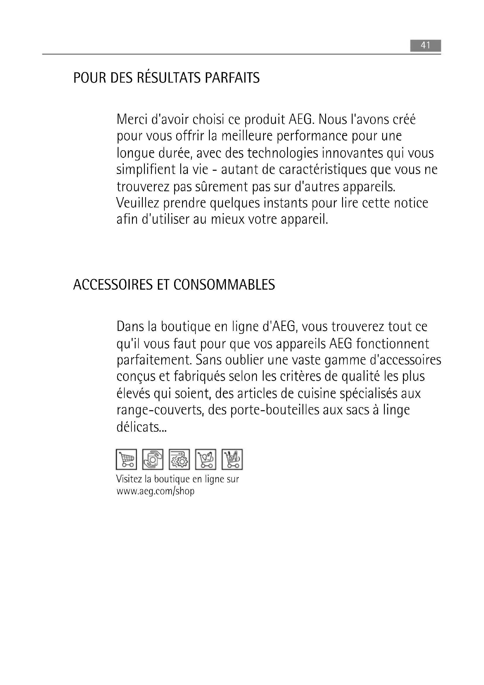 Dans la boutique en ligne d'AEG, vous trouverez tout ce qu'il vous faut pour que vos appareils AEG fonctionnent parfaitement. Sans oublier une vaste gamme d'accessoires conçus et fabriqués selon les critères de qualité les plus élevés qui soient, des articles de cuisine spécialisés aux range-couverts, des porte-bouteilles aux sacs à linge délicats... Visitez la boutique en ligne sur www.aeg.com/shop 41SOMMAIRE 43 Consignes de sécurité 46 Bandeau de commande 49 Première utilisation 49 Utilisation quotidienne 51 Conseils 51 Entretien et nettoyage 53 En cas d'anomalie de fonctionnement 55 Caractéristiques techniques 55 Installation 59 Bruits 61 En matière de sauvegarde de l'environnement Les symboles suivants sont utilisés dans ce manuel: Informations importantes pour votre sécurité et pour éviter d’abîmer l’appareil. Informations générales et conseils Informations écologiques Sous réserve de modifications 42 SommaireCONSIGNES DE SÉCURITÉ Pour votre sécurité et garantir une utilisation correcte de l'appareil, lisez attentivement cet- te notice, y compris les conseils et avertissements, avant d'installer et d'utiliser l'appareil pour la première fois. Pour éviter toute erreur ou accident, veillez à ce que toute personne qui utilise l'appareil connaisse bien son fonctionnement et ses fonctions de sécurité. Con- servez cette notice avec l'appareil. Si l'appareil doit être vendu ou cédé à une autre person- ne, veillez à remettre cette notice au nouveau propriétaire, afin qu'il puisse se familiariser avec son fonctionnement et sa sécurité. Pour la sécurité des personnes et des biens, conservez et respectez les consignes de sécurité figurant dans cette notice. Le fabricant décline toute responsabilité en cas de dommages dus au non-respect de ces instructions. Sécurité des enfants et des personnes vulnérables