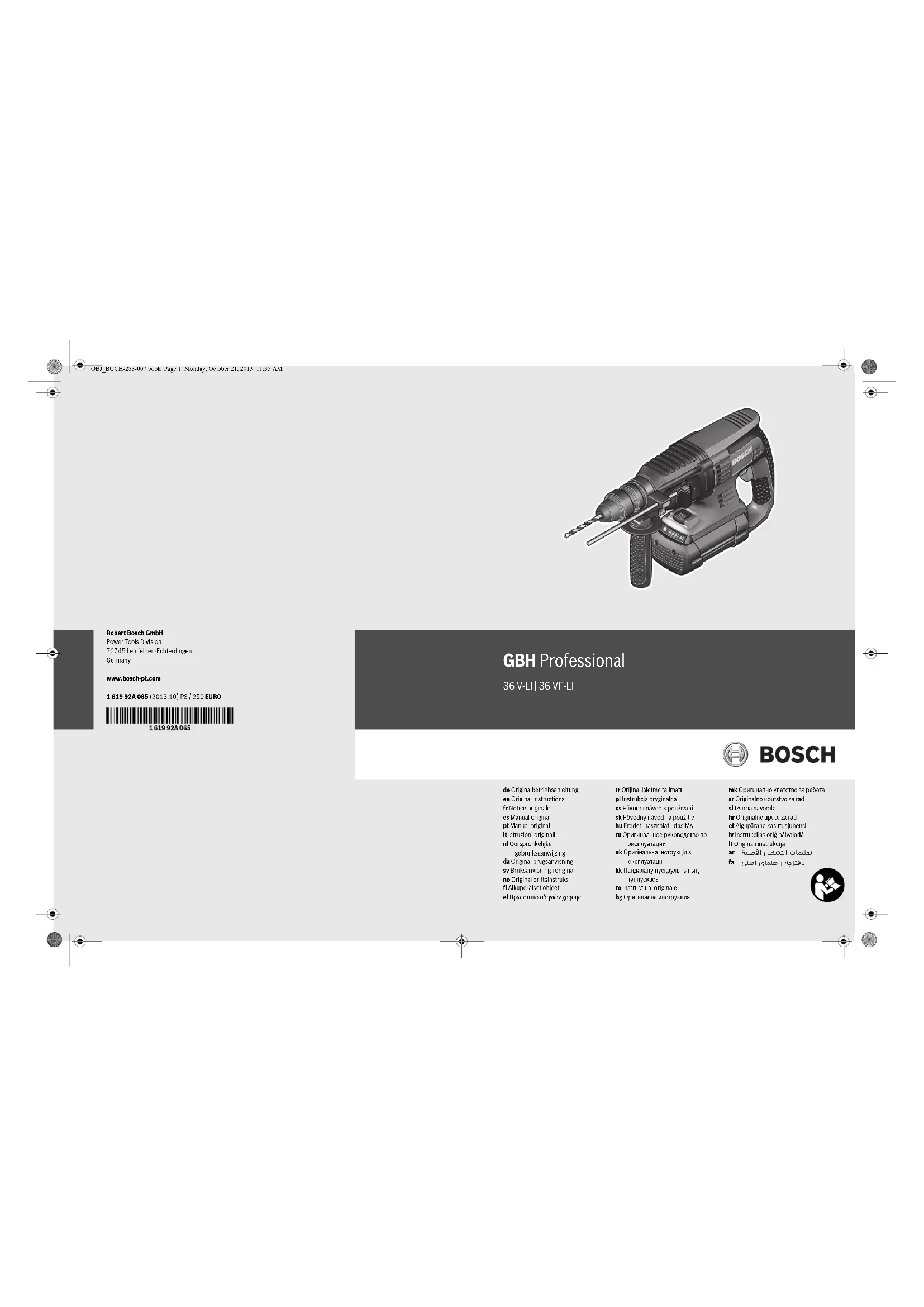 and firmly turn the front sleeve 24 in the direction of the arrow until a distinct latching noise can be heard. – Check the tight seating by pulling the tool. Note: If the tool holder was opened to the stop, then the latch- ing noise possibly may be heard while closing the tool holder and the tool holder will not close. In this case, turn the front sleeve 24 once in the opposite di- rection of the arrow. Afterwards, the tool holder can be closed (tightened) again. – Turn the mode selector switch 11 to the “drilling” position. Removing Drilling Tools without SDS-plus (GBH 36 VF-LI) (see figure K) – Firmly hold the retaining ring 25 of the quick change chuck. Open the tool holder by turning the front sleeve 24 in the direction of the arrow until the tool can be removed. Dust Extraction with GDE 16 Plus (Accessory) Dusts from materials such as lead-containing coatings, some wood types, minerals and metal can be harmful to one’s health. Touching or breathing-in the dusts can cause allergic reactions and/or lead to respiratory infections of the user or bystanders. Certain dusts, such as oak or beech dust, are considered as carcinogenic, especially in connection with wood-treat- ment additives (chromate, wood preservative). Materials containing asbestos may only be worked by specialists. – As far as possible, use a dust extraction system suita- ble for the material. – Provide for good ventilation of the working place. – It is recommended to wear a P2 filter-class respirator. Observe the relevant regulations in your country for the materials to be worked. Prevent dust accumulation at the workplace. Dusts can easily ignite. A GDE 16 Plus (accessory) is required for dust extraction. The vacuum cleaner must be suitable for the material being worked. When vacuuming dry dust that is especially detrimental to health or carcinogenic, use a special vacuum cleaner. OBJ_BUCH-283-007.book Page 18 Monday, October 21, 2013 11:35 AMEnglish | 19 Bosch Power Tools 1 619 92A 065 | (21.10.13) Operation Starting Operation Inserting the battery – Set the rotational direction switch 8 to the centre position to protect the power tool against accidental starting. – Insert the charged battery 17 from the front into the base of the power tool. Push the battery completely into the base until the red stripe can no longer be seen and the bat- tery is securely locked. Setting the operating mode The operating mode of the power tool is selected with the mode selector switch 11. Note: Change the operating mode only when the machine is switched off! Otherwise, the machine can be damaged. – To change the operating mode, push the release button 10 and turn the mode selector switch 11 to the requested po- sition until it can be heard to latch. Reversing the rotational direction (see figure L) The rotational direction switch 8 is used to reverse the rota- tional direction of the machine. However, this is not possible with the On/Off switch 9 actuated. Right rotation: Push the rotational direction switch 8 left to the stop. Left rotation: Push the rotational direction switch 8 right to the stop. Set the direction of rotation for hammer drilling, drilling and chiselling always to right rotation. Switching On and Off To save energy, only switch the power tool on when using it. –To start the machine, press the On/Off switch 9. When starting the machine for the first time, a starting delay is possible, as the electronic system of the power tool has to configure itself first. –To switch off the machine, release the On/Off switch 9. Setting the Speed/Impact Rate The speed/impact rate of the switched on power tool can be variably adjusted, depending on how far the On/Off switch 9 is pressed. Light pressure on the On/Off switch 9 results in low speed/im- pact rate. Further pressure on the switch increases the speed/impact rate. Safety Clutch If the tool insert becomes caught or jammed, the drive to the drill spindle is interrupted. Because of the forces that occur, always hold the power tool firmly with both hands and provide for a secure stance. If the power tool jams, switch the machine off and loos- en the tool insert. When switching the machine on with the drilling tool jammed, high reaction torques can oc- cur. Temperature Control Indicator The red LED of the temperature control indicator 14 signals that the battery or the electronics of the power tool (when the battery is inserted) are not within the optimum temperature range. In this case, the power tool will not operate at full ca- pacity. Temperature control of the battery: –The red LED 14 lights up continuously after inserting the battery into the charger: The battery is not within the charging temperature range between 0 °C and 45 °C and cannot be charged. –The red LED 14 flashes when pushing button 16 or press- ing the On/Off switch 9 (when the battery is inserted): The battery is not wihin the temperature range for operation of –10 °C to +60 °C. – For battery temperatures over 70 °C, the power tool switches off until the battery is in the optimal temperature range again. Temperature control of the power tool electronics: –The red LED 14 lights up continuously when pressing the On/Off switch 9: The temperature of the machine’s elec- tronics is below 5 °C or above 75 °C. – At a temperature above 90 °C , the electronics of the pow- er tool switch off until the temperature is within the allow- able temperature range again. Working Advice Changing the Chiselling Position (Vario-Lock) The chisel can be locked in 36 positions. In this manner, the optimum working position can be set for each application. – Insert the chisel into the tool holder. – Turn the mode selector switch 11 to the “Vario-Lock” posi- tion (see “Setting the operating mode”, page 19). – Turn the tool holder to the desired chiselling position. – Turn the mode selector switch 11 to the “chiselling” posi- tion. The tool holder is now locked. Positio