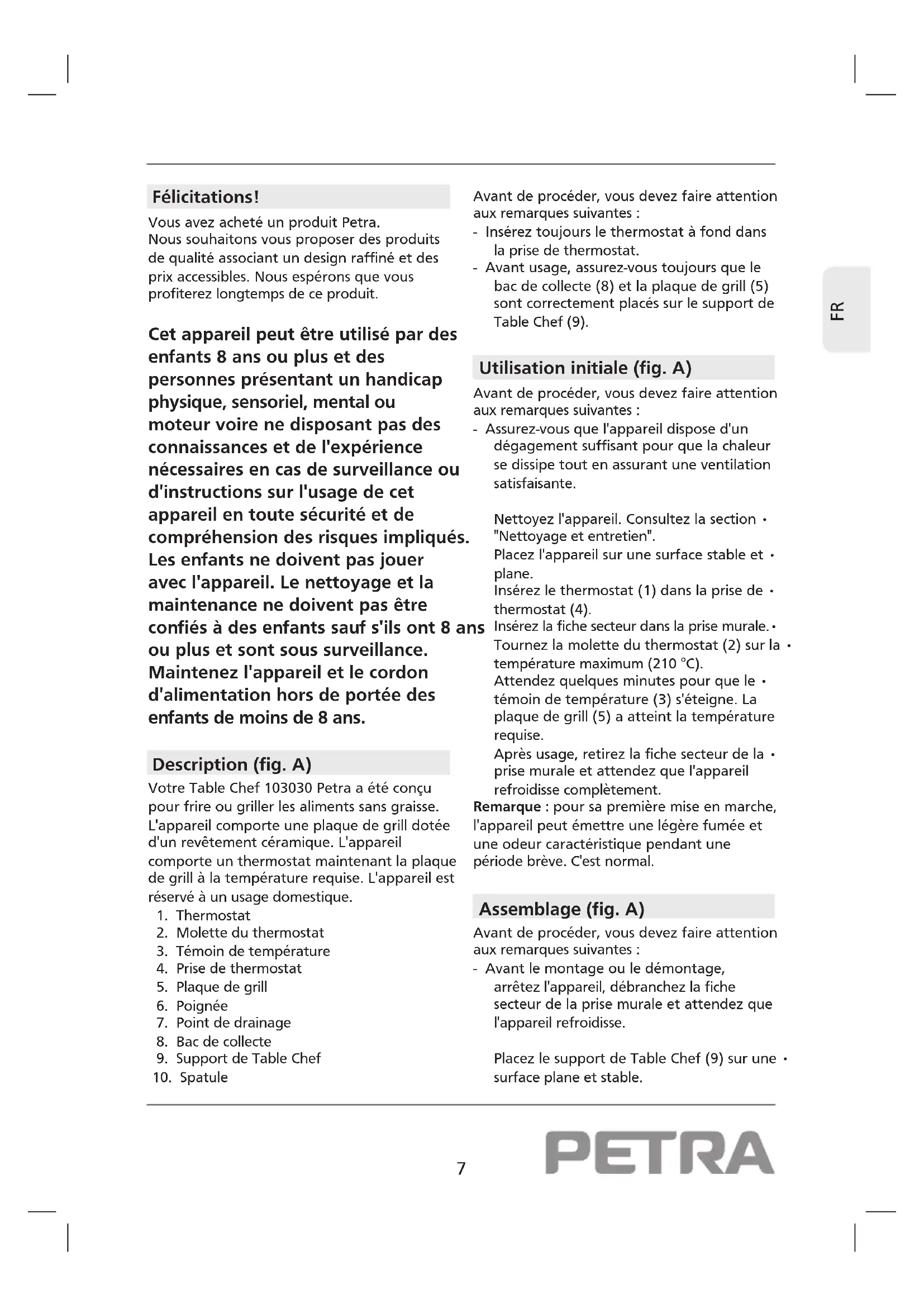 Félicitations! Vous avez acheté un produit Petra. Nous souhaitons vous proposer des produits de qualité associant un design raffiné et des prix accessibles. Nous espérons que vous profiterez longtemps de ce produit. Cet appareil peut être utilisé par des enfants 8 ans ou plus et des personnes présentant un handicap physique, sensoriel, mental ou moteur voire ne disposant pas des connaissances et de l'expérience nécessaires en cas de surveillance ou d'instructions sur l'usage de cet appareil en toute sécurité et de compréhension des risques impliqués. Les enfants ne doivent pas jouer avec l'appareil. Le nettoyage et la maintenance ne doivent pas être confiés à des enfants sauf s'ils ont 8 ans ou plus et sont sous surveillance. Maintenez l'appareil et le cordon d'alimentation hors de portée des enfants de moins de 8 ans. Description (fig. A) Votre Table Chef 103030 Petra a été conçu pour frire ou griller les aliments sans graisse. L'appareil comporte une plaque de grill dotée d'un revêtement céramique. L'appareil comporte un thermostat maintenant la plaque de grill à la température requise. L'appareil est réservé à un usage domestique.