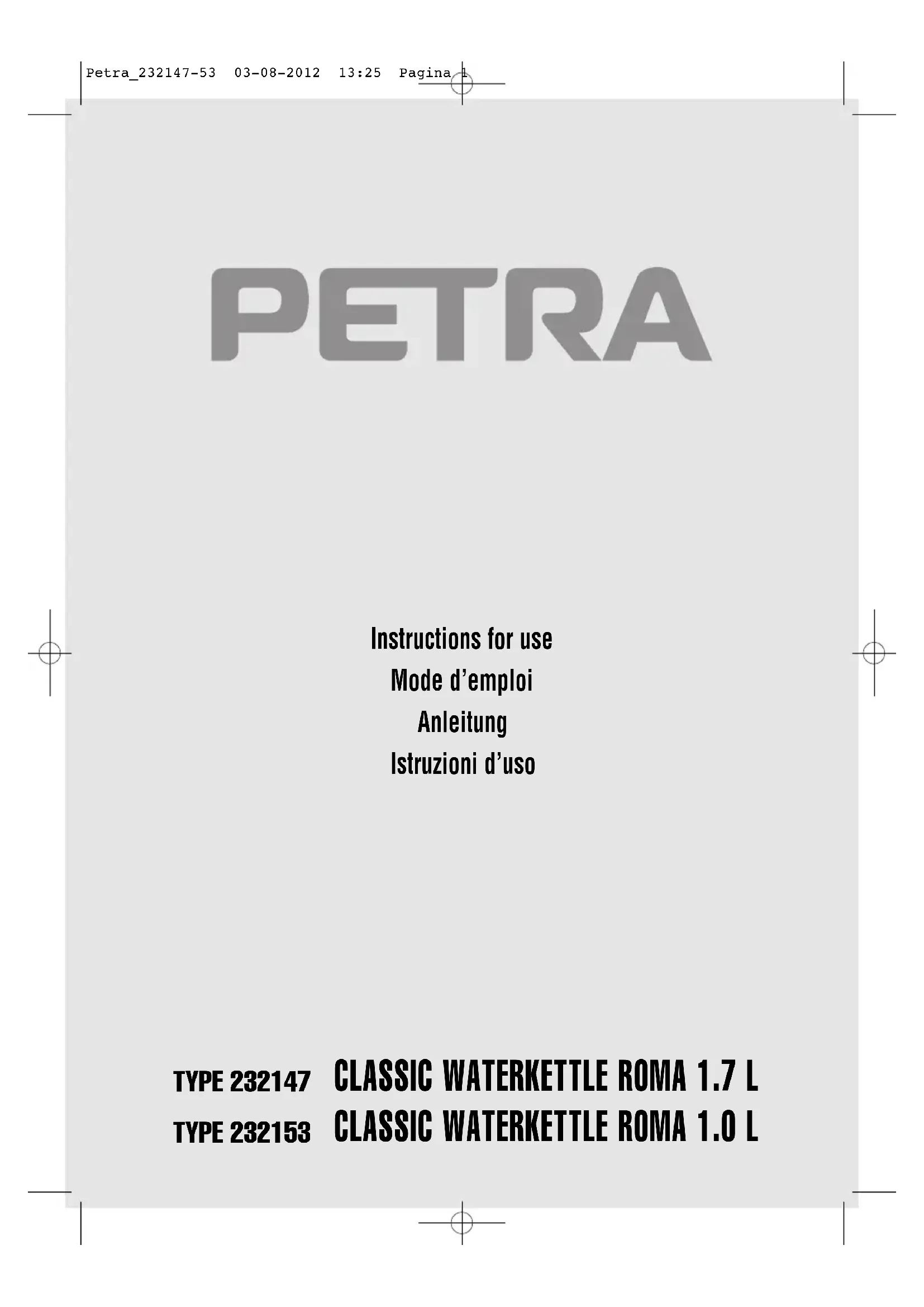 The wires in the mains lead are coloured in accordance with the following code: BLUE = neutral, BROWN = LIVE, GREEN-YELLOW = EARTH As the colours of the wire in the mains lead of this appliance may not correspond with the colour markings identifying the terminals on your plug, proceed as follows: The wire which is coloured BLUE must be connected to the terminal which is marked with the letter N or coloured black. The wire which is coloured BROWN must be connected to the terminal which is marked with the letter L or coloured red. The wire which is coloured GREEN-YELLOW must be connected to the earth terminal which is marked with the letter E or or coloured green and yellow. PETRA CLASSIC WATERKETTLE ROMA 1.7L / 1.0L ART. 232147 / 232153 AVANT L'EMPLOI Lisez attentivement ce mode d'emploi et conservez-le afin de pouvoir le consulter ultérieurement si nécessaire. Assurez-vous que le voltage de votre logement correspond à celui indiqué sur l'appareil. Raccordez l’appareil uniquement à une prise de terre. La bouilloire est équipée d’un filtre (amovible) intégré dans l’orifice du verseur. La bouilloire se détache de son socle et peut pivoter de 360 degrés ce qui la rend très pratique à utiliser aussi bien pour les droi- tiers que les gauchers. L’élément de chauffe intégré est résistant au calcaire ce qui lui garantit une longue durée de vie. Equipée d’un interrupteur marche/arrêt éclairé et d’un dispositif de verrouillage du couver- cle pour la sécurité. Pour ouvrir le couvercle, il suffit d’appuyer sur le bouton. Triple sécurité intégrée : arrêt automatique, protection anti-usage à sec et protection anti-surchauffe.